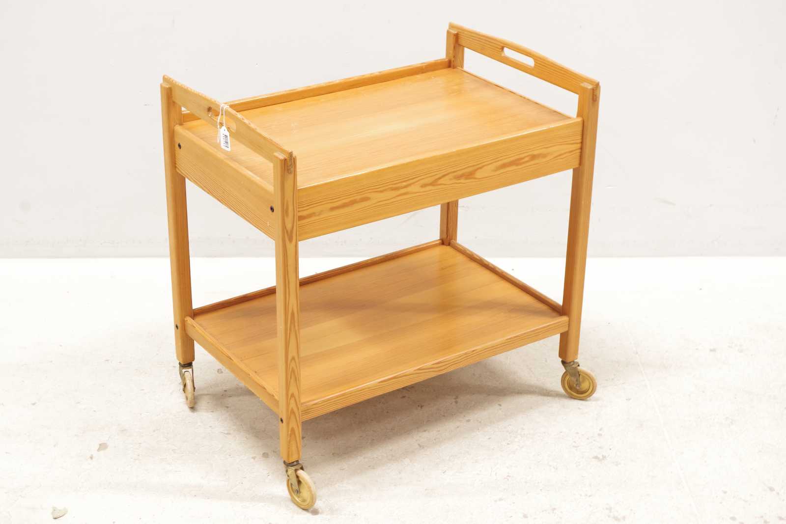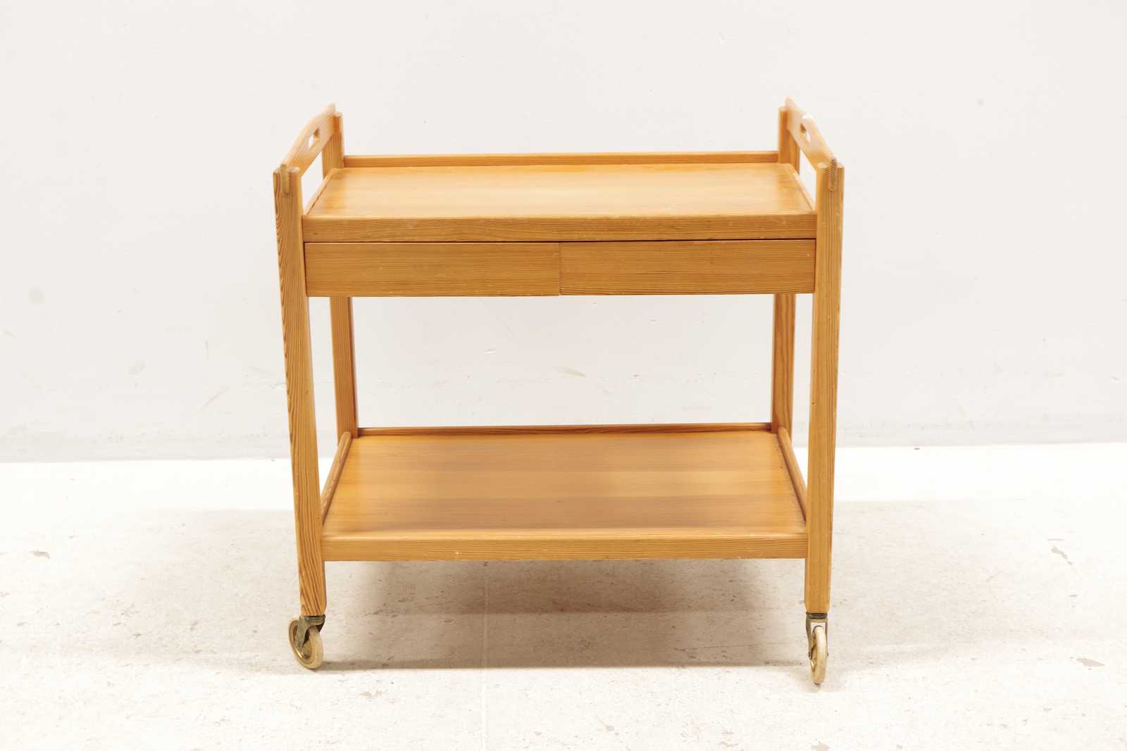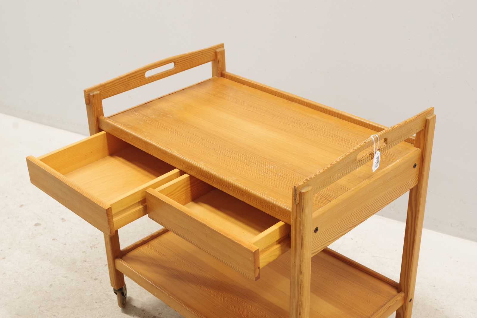 Bilder SERVERINGSVAGN 2st lådor, i furu, 1900 talets andra hälft. (bruksslitage, 1st hjul löst)