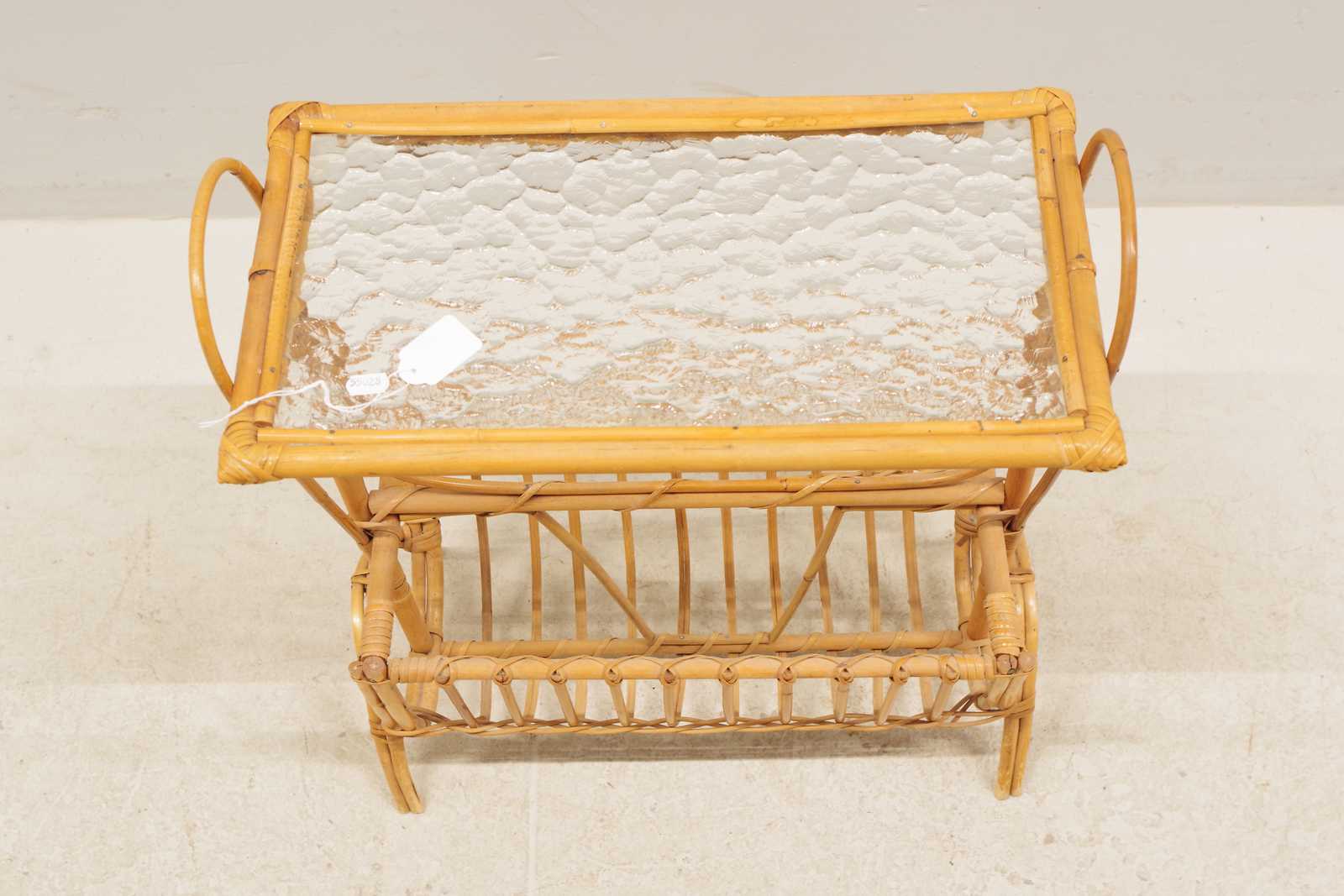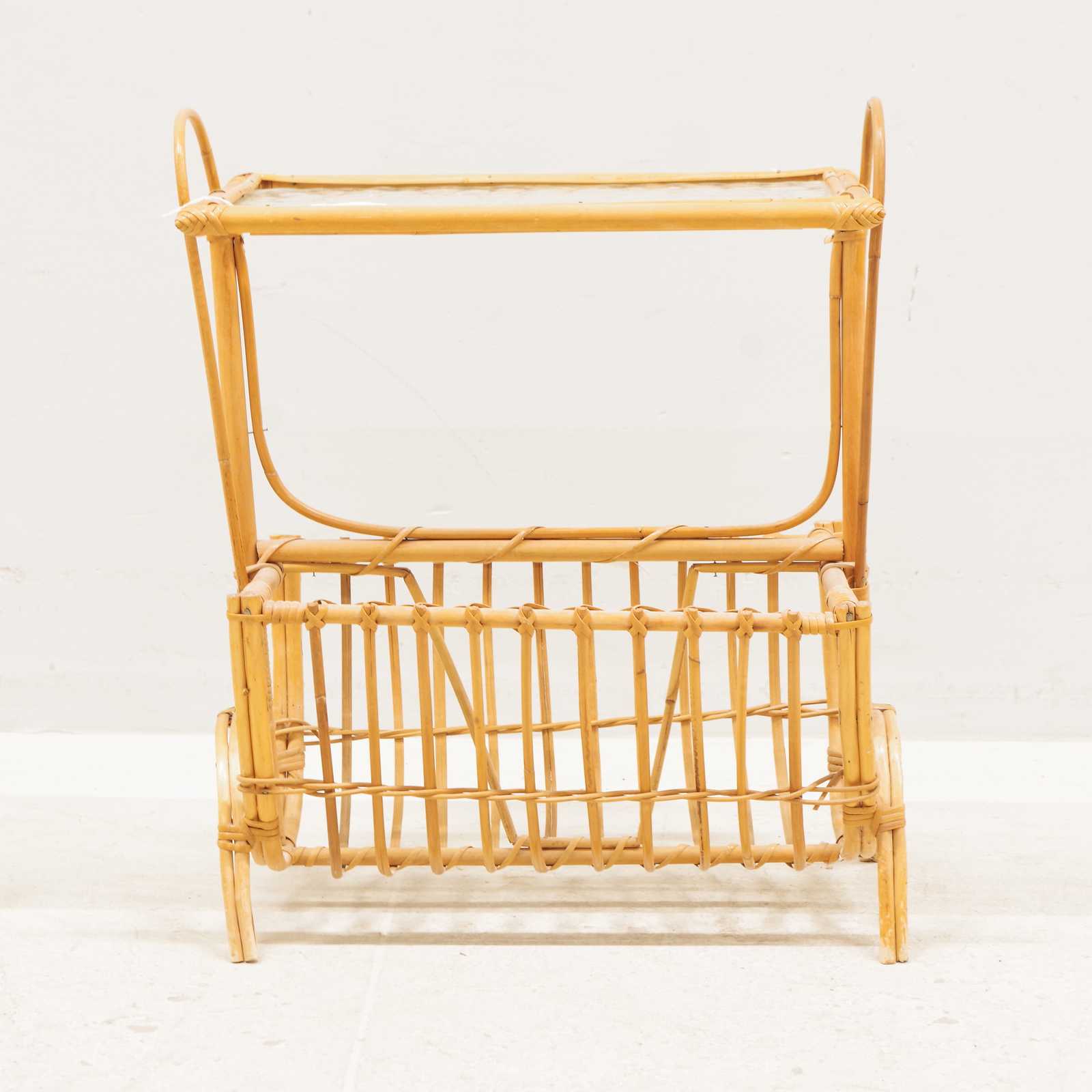Bilder SIDOBORD med tidningsställ, glasskiva, rotting, 1900 talets mitt. H:50x 44x 24cm