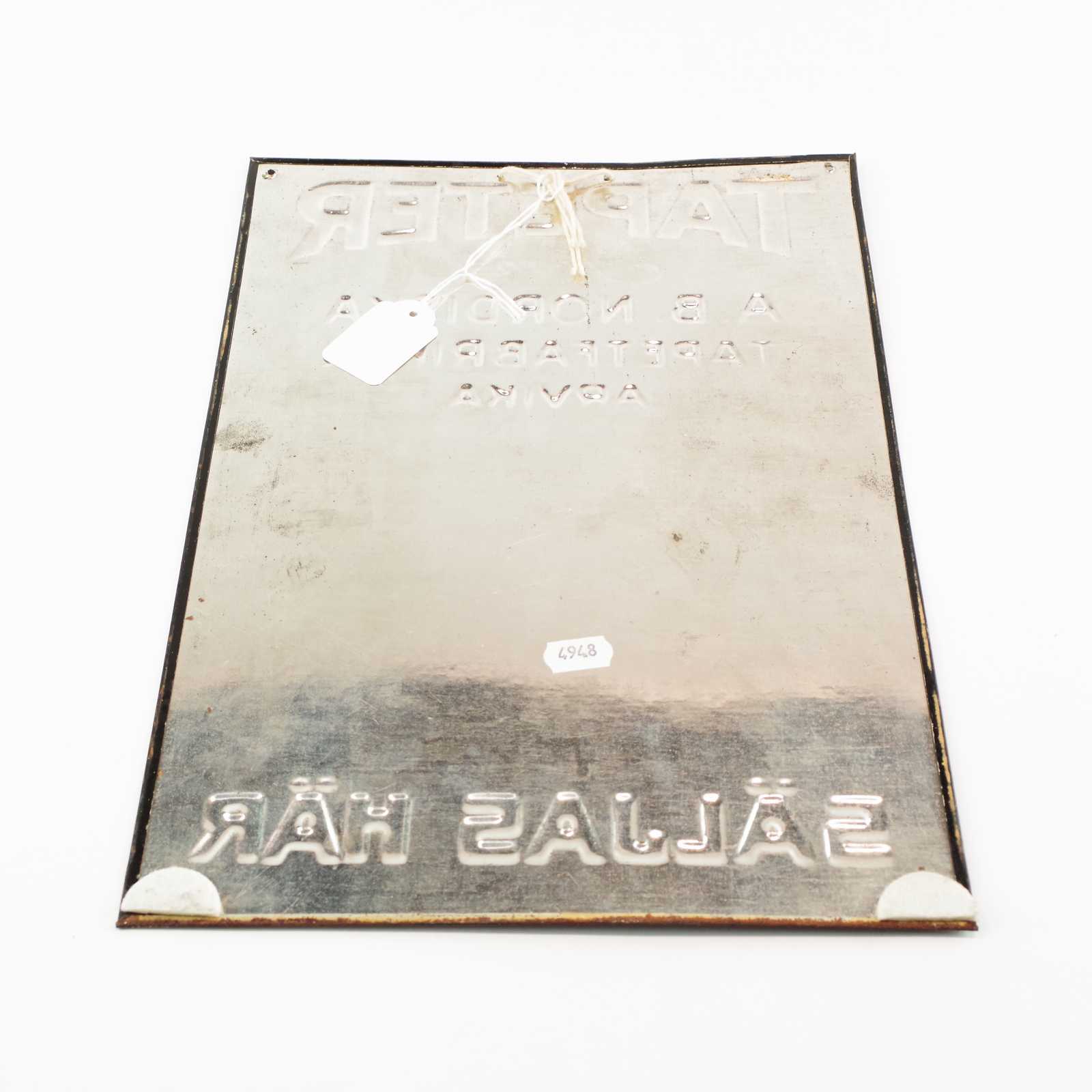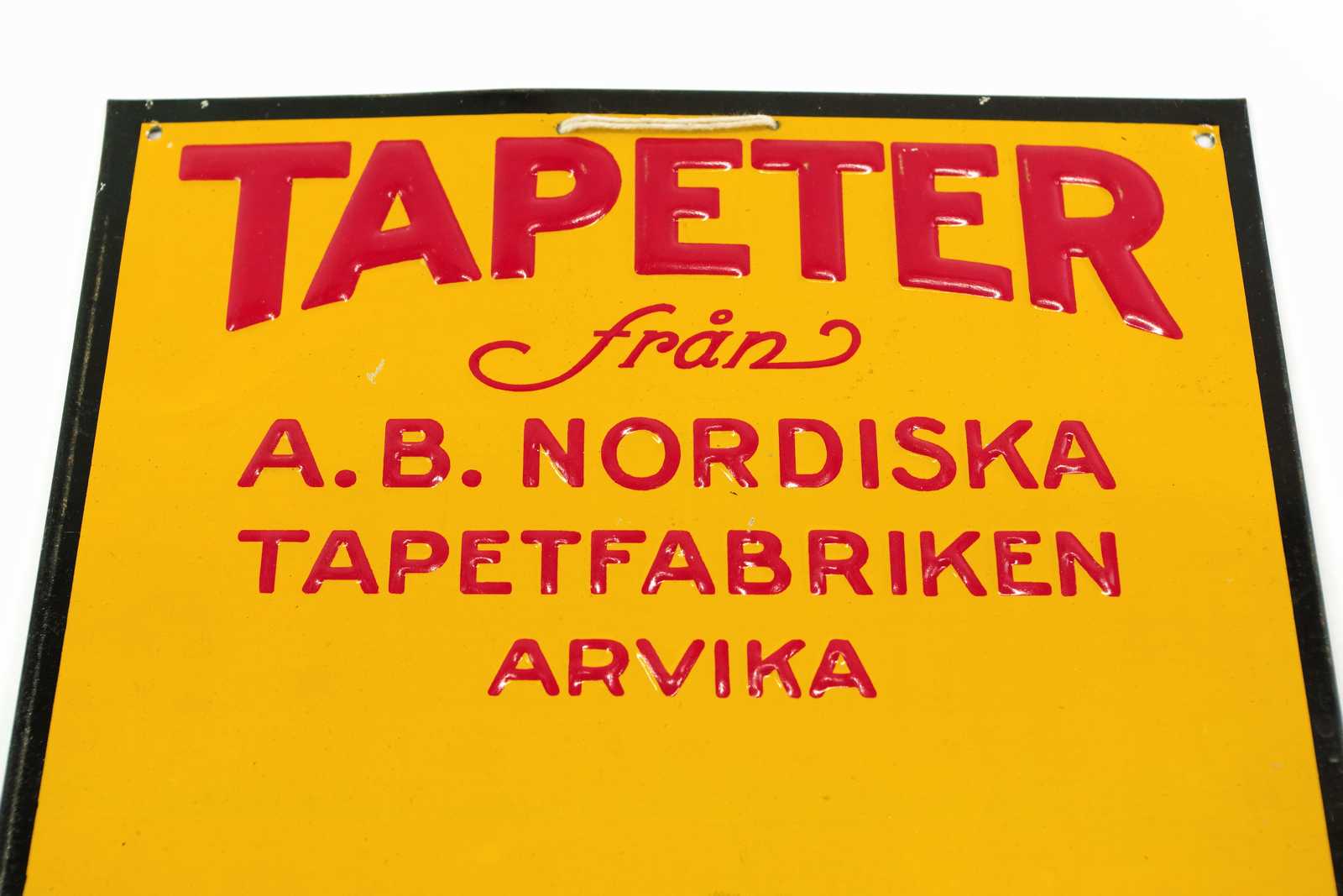 PLÅTSKYLT Tapetfabriken Arvika, från 1910. 34x24 cm. (mindre märken och rost förekommer)