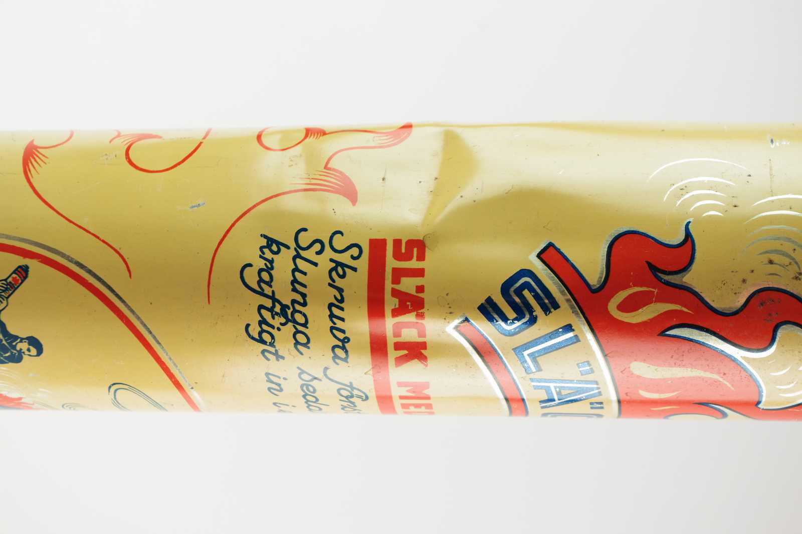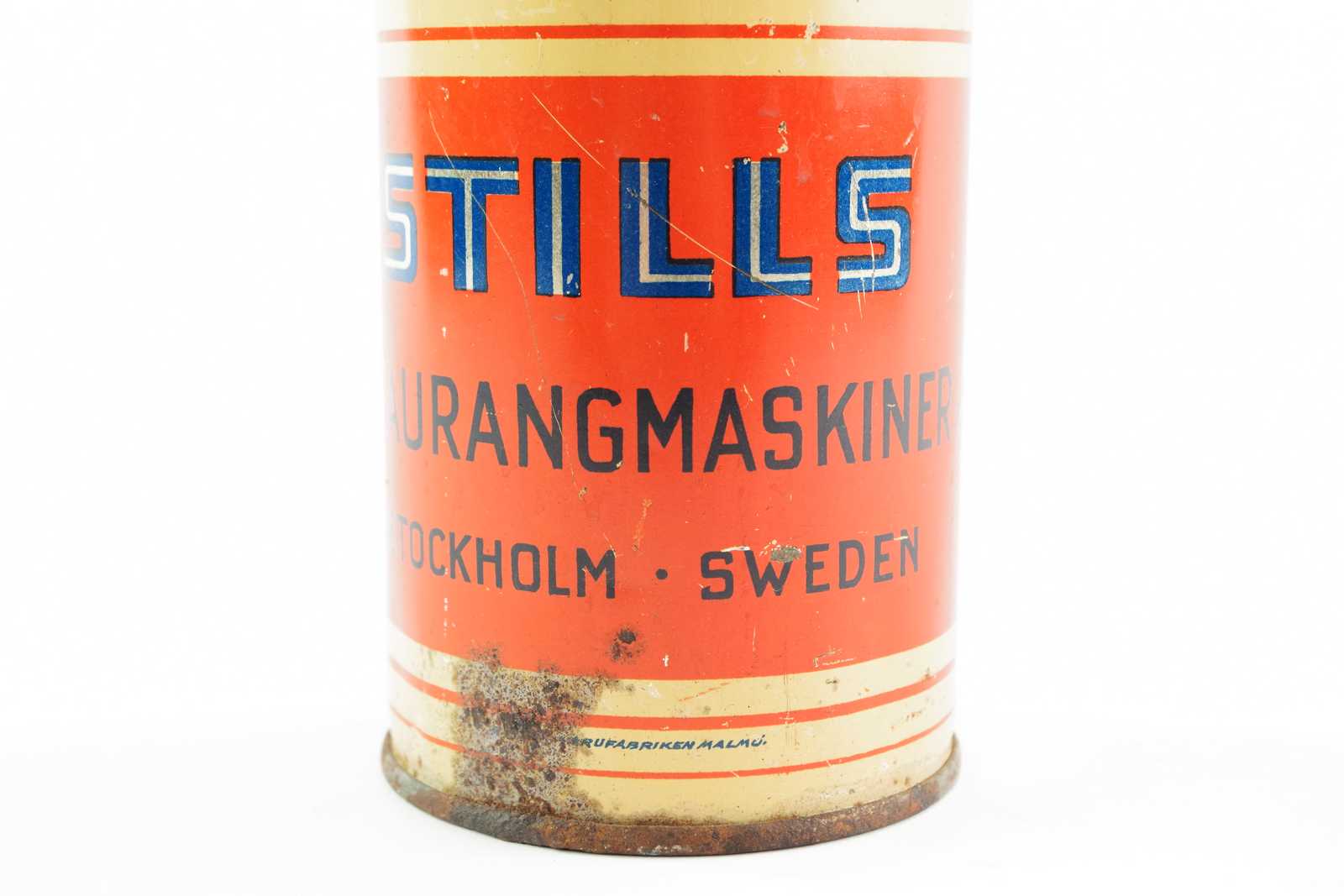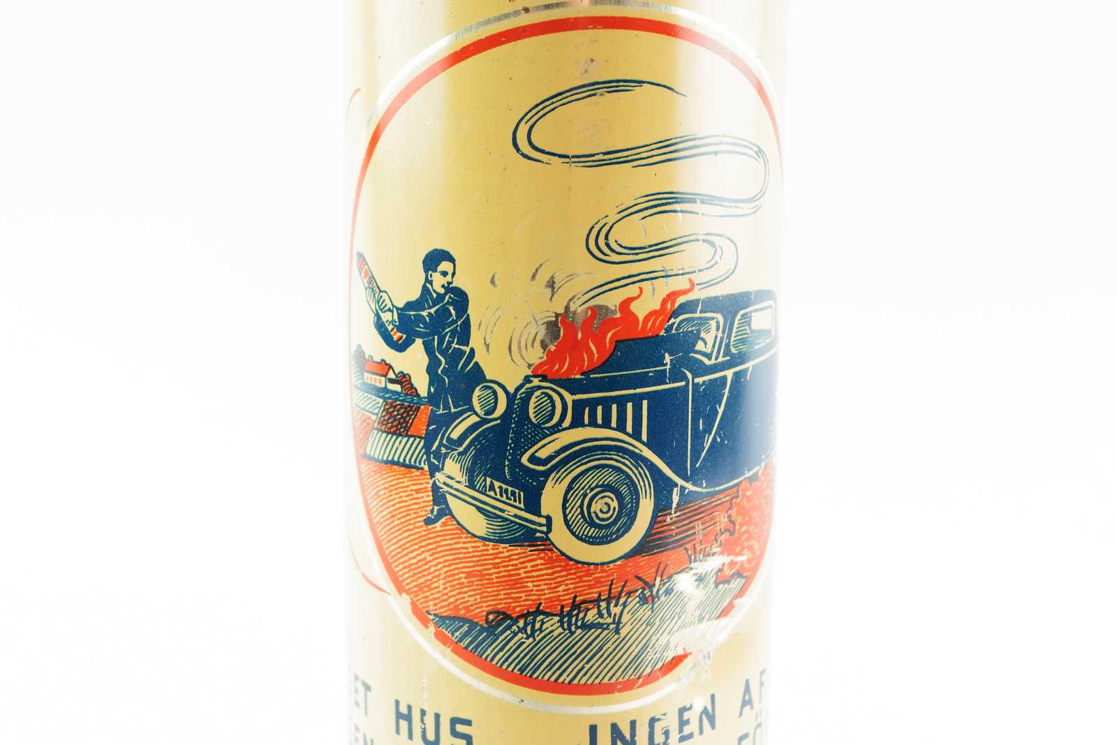 Bilder BRANDSLÄCKARE Släcko, "Släck med släcko, Stills Resturangmaskiner A.B Stockholm, i plåt. H:50cm D:7.5cm (saknar innehåll, bucklig, rost, märken)