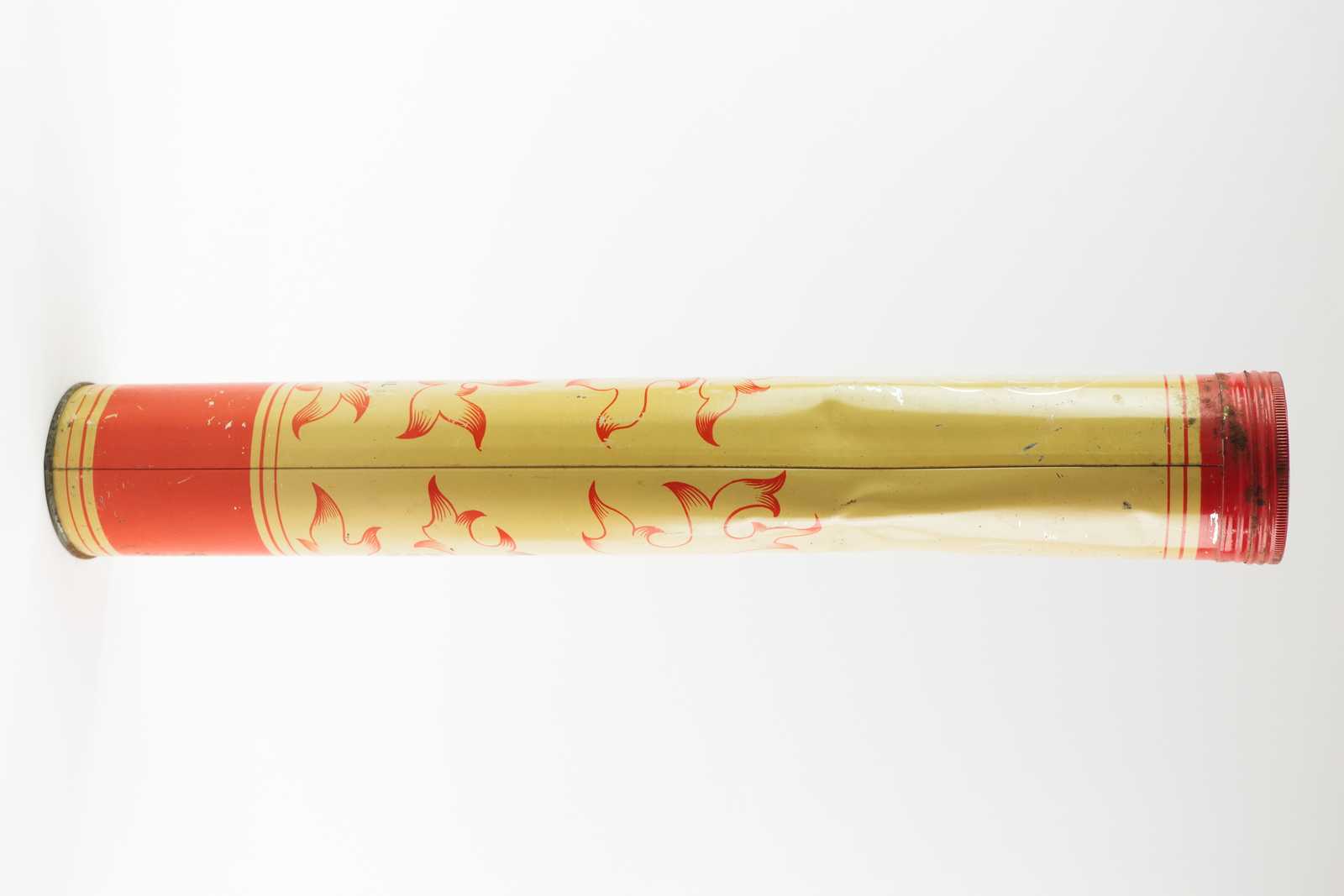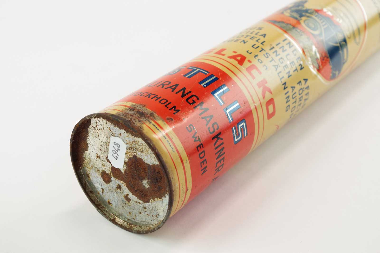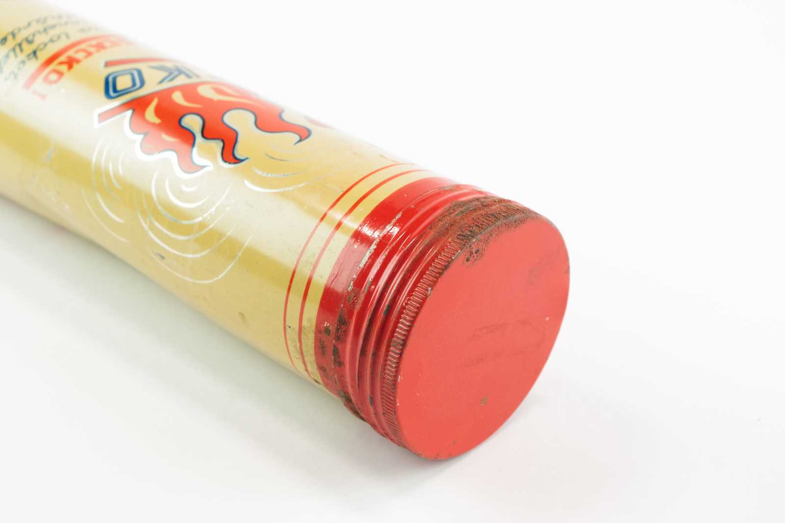 Bilder BRANDSLÄCKARE Släcko, "Släck med släcko, Stills Resturangmaskiner A.B Stockholm, i plåt. H:50cm D:7.5cm (saknar innehåll, bucklig, rost, märken)