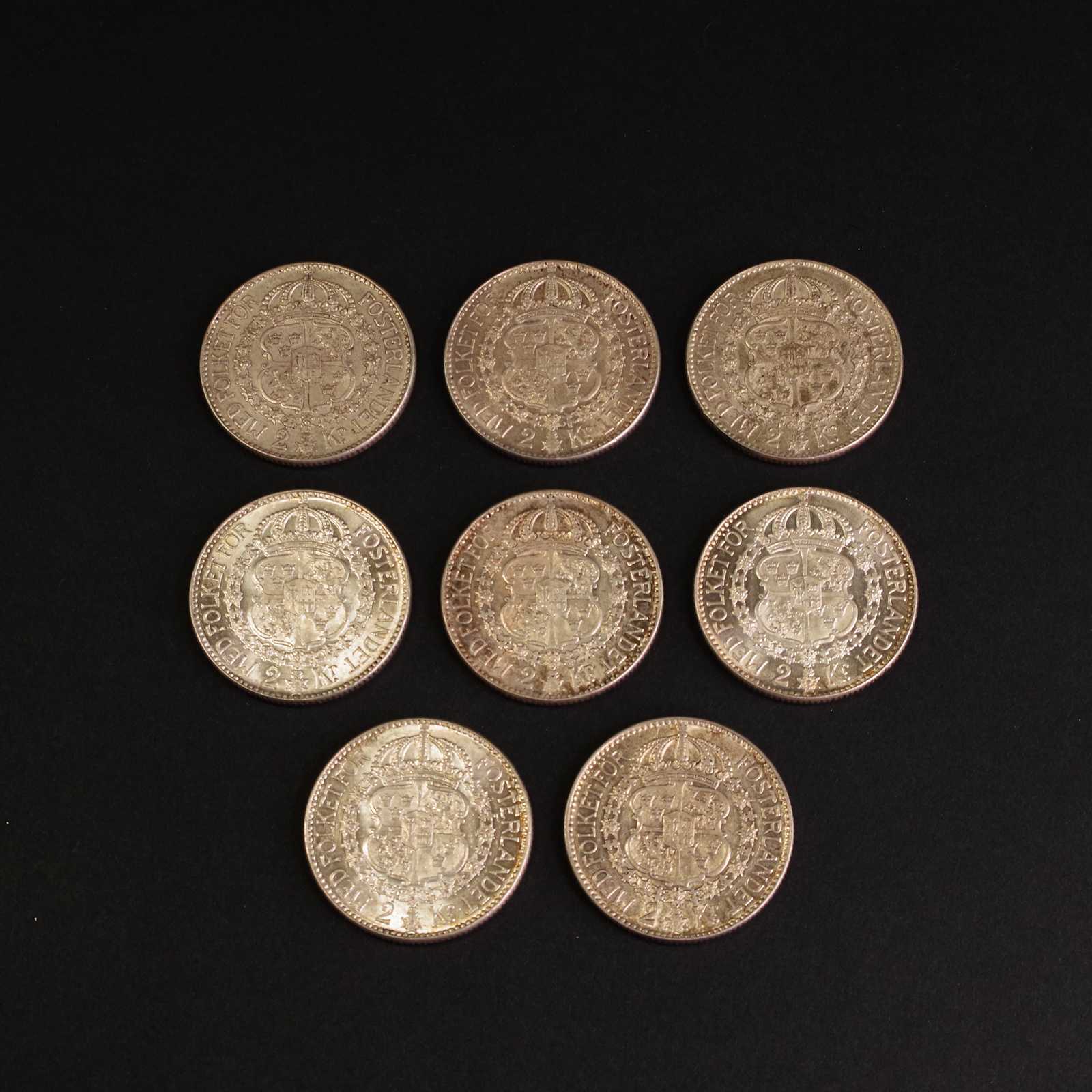 Auktioner Guld, Silver & Smycken SILVERMYNT 8st, 2 kronor, 1937, 80% silver. vikt: 120g