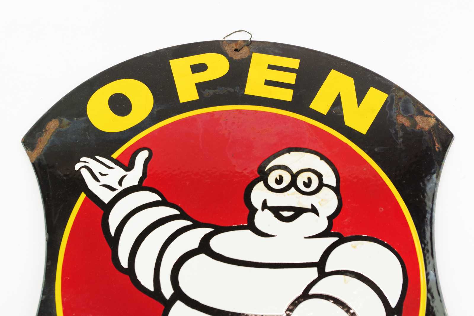 REKLAMSKYLT / EMALJSKYLT Michelin. 40x47cm (rost, emaljskador, fläckar)