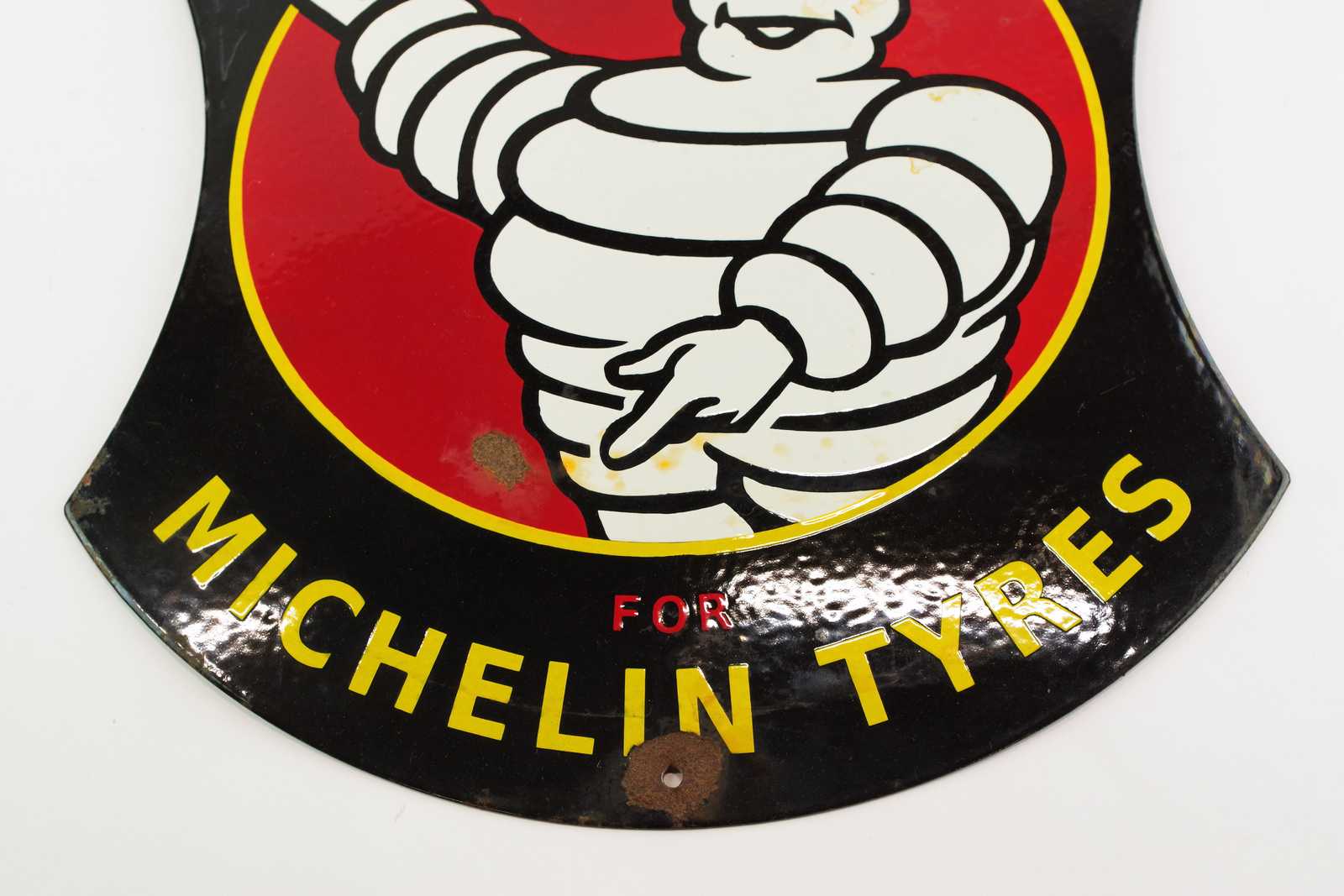Bilder REKLAMSKYLT / EMALJSKYLT Michelin. 40x47cm (rost, emaljskador, fläckar)