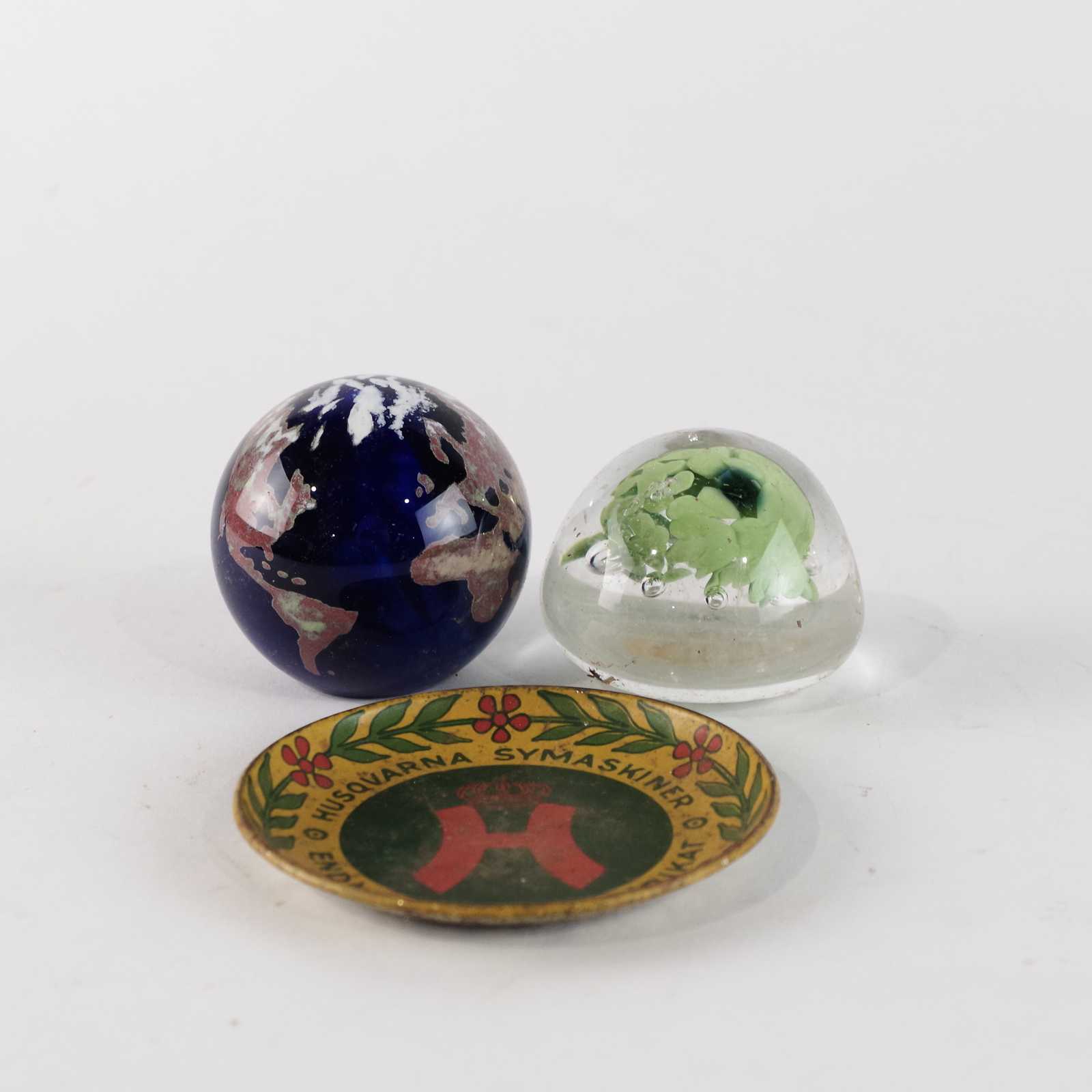 Bilder NÅLFAT plåt, Husqvarna BREVPRESSAR konstglas. D:9cm nålfat.