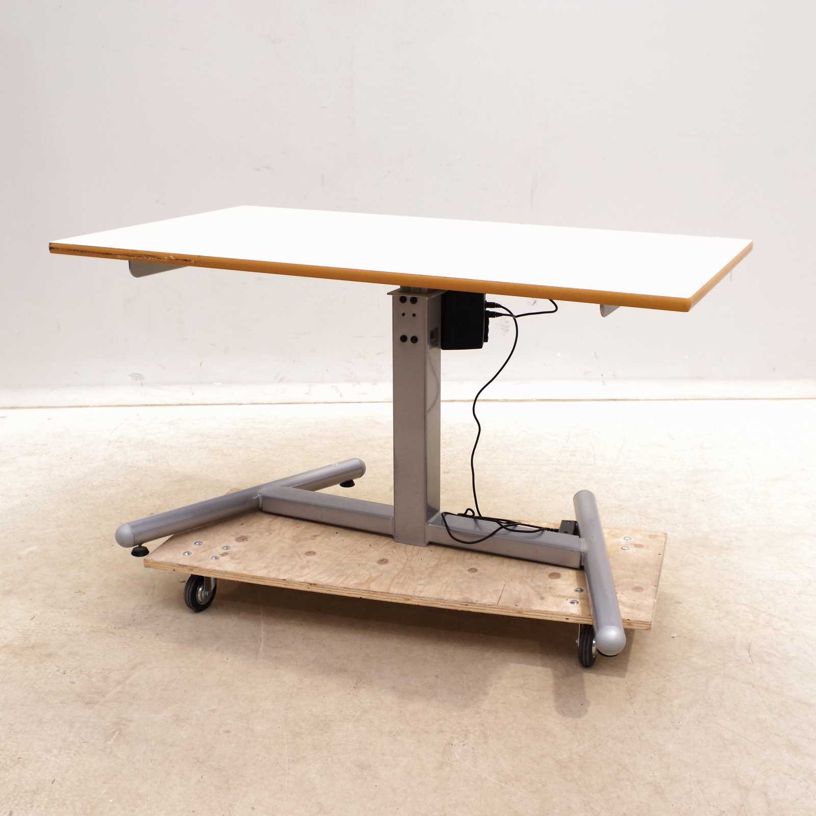 Tvådelat, gråmålad med blå detaljer, överdel med glas och spröjs, glasade sidor, blå invändig målning, beslag av patinerad mässing, överdel med fasta hyllplan, underdel med två lådor och två skåpsdörrar med bakomliggande hyllplan, nyckel finns, tot höjd ca 212, 152 x 45. cm