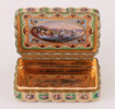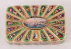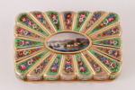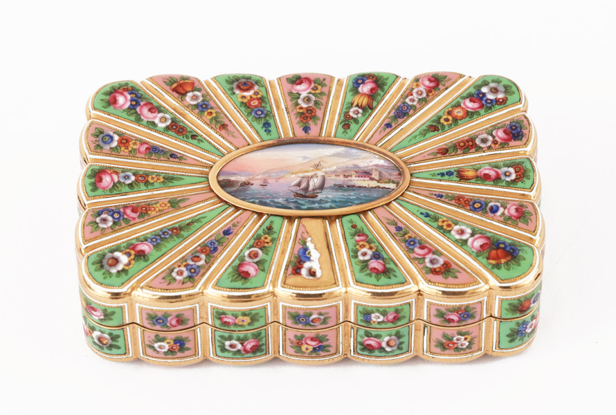 Emaljarbete. Med dekor av blomster. Mittpartier och invändigt med landskapsdekor och båtar. Förefaller ostämplad.