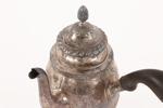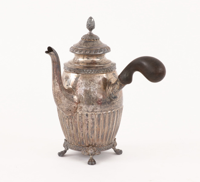 Godronnerad dekor. Fötter i form av lejontassar. Krönt med pinjekotte. Handtag i svärtad trä.