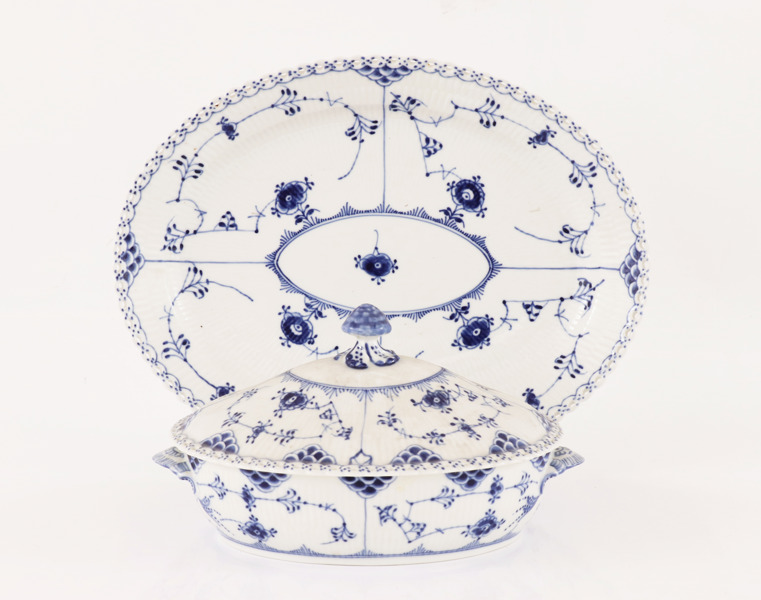 Terrin med lock samt uppläggningsfat ,"Musselmalet", Royal Copenhagen