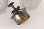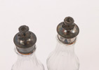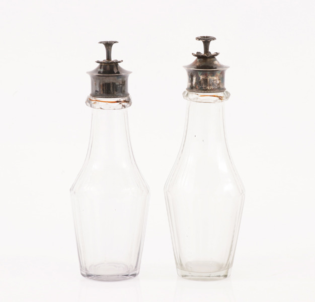 Lock i silver av Pehr Zethelius, Stockholm. Flaskor med fasettslipning. Lockknopp i form av blomma.