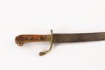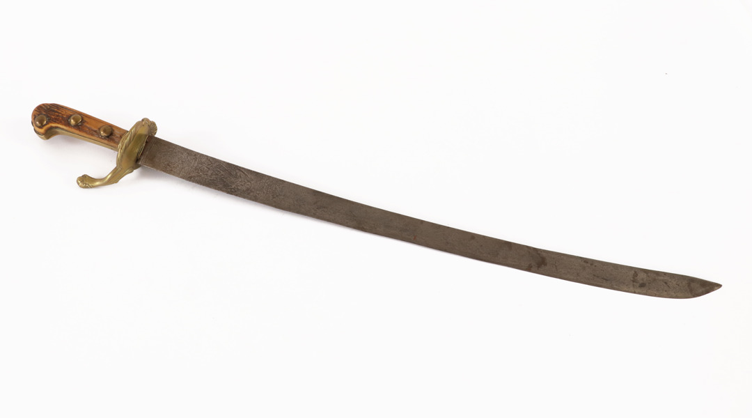 Handtag i mässing och horn. Klinga av stål, med etsad dekor av figur och text "Vivat Pandor".