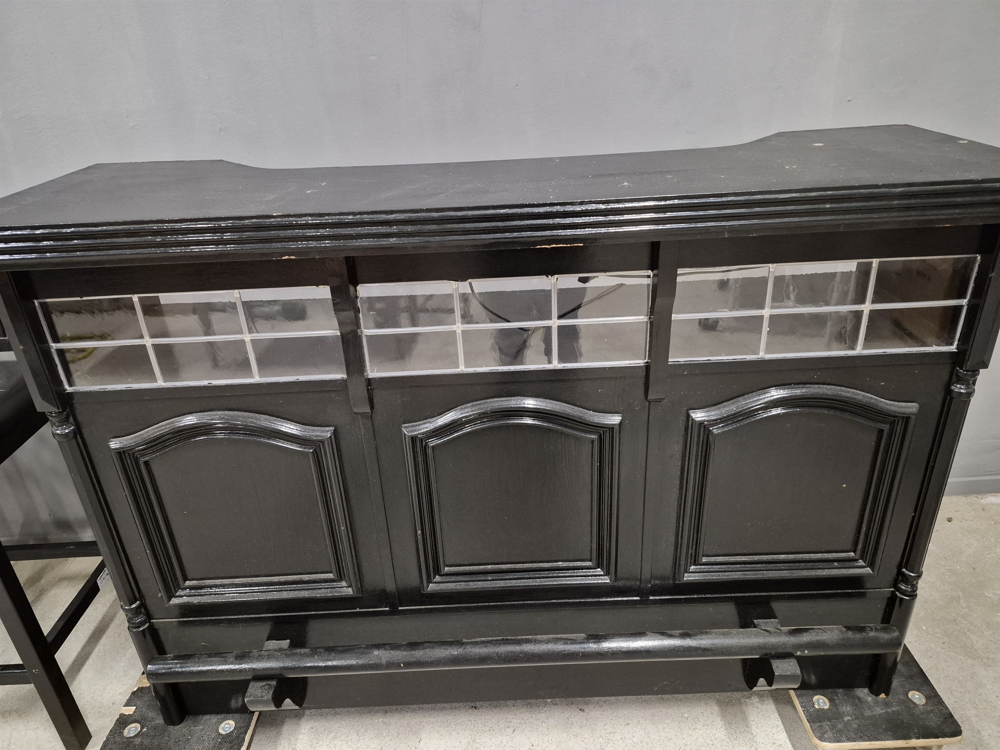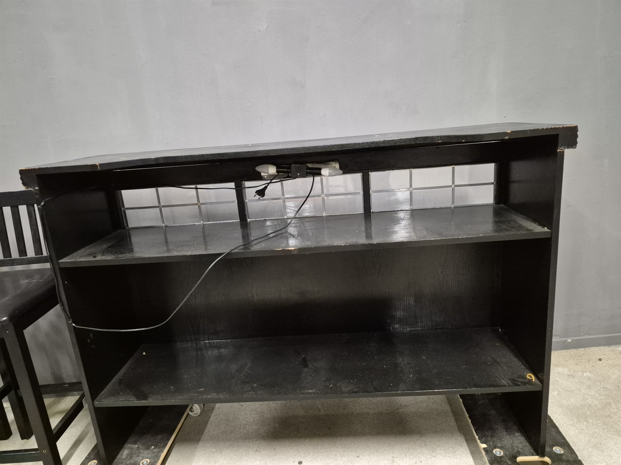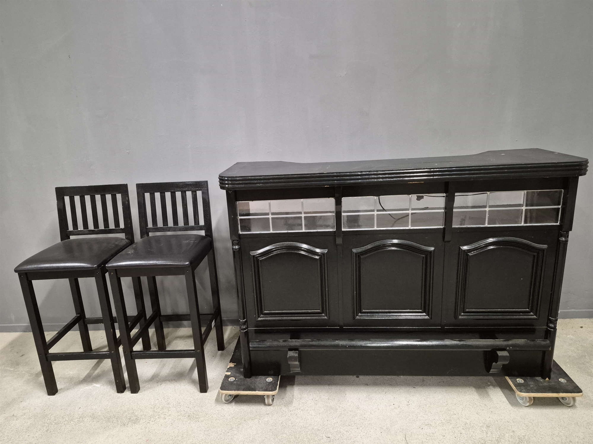 Bardisk med 2 st barstolar, skav finns, mått på bardisk höjd 105 cm, längd 154 cm, bredd 78