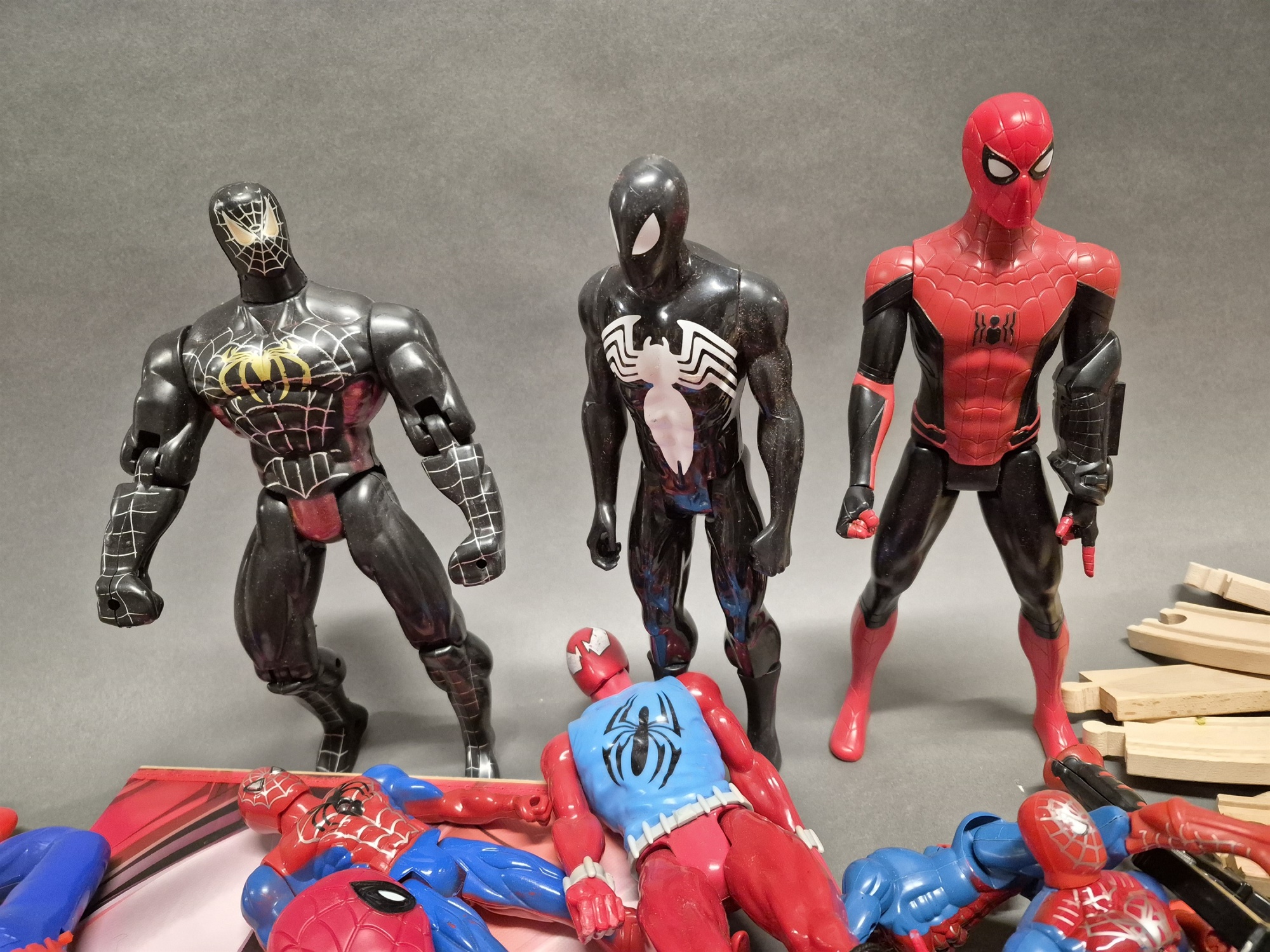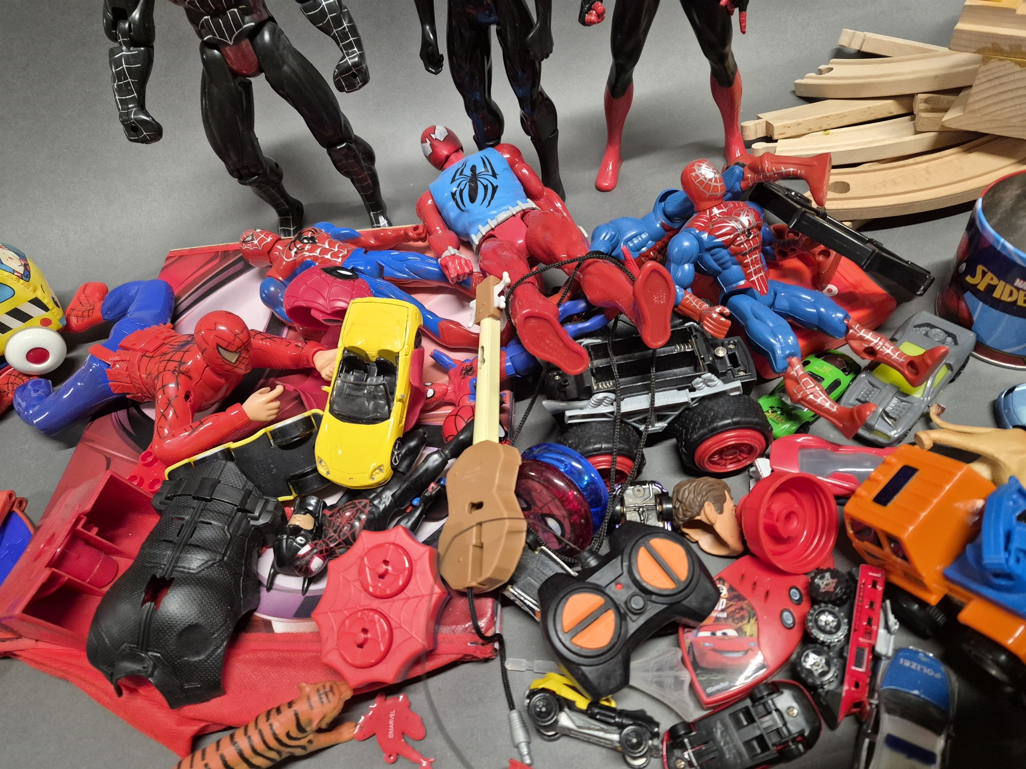 Parti leksaker bla trätågbana, Spiderman actionfigurer och bilar, högsta höjd 30 cm
