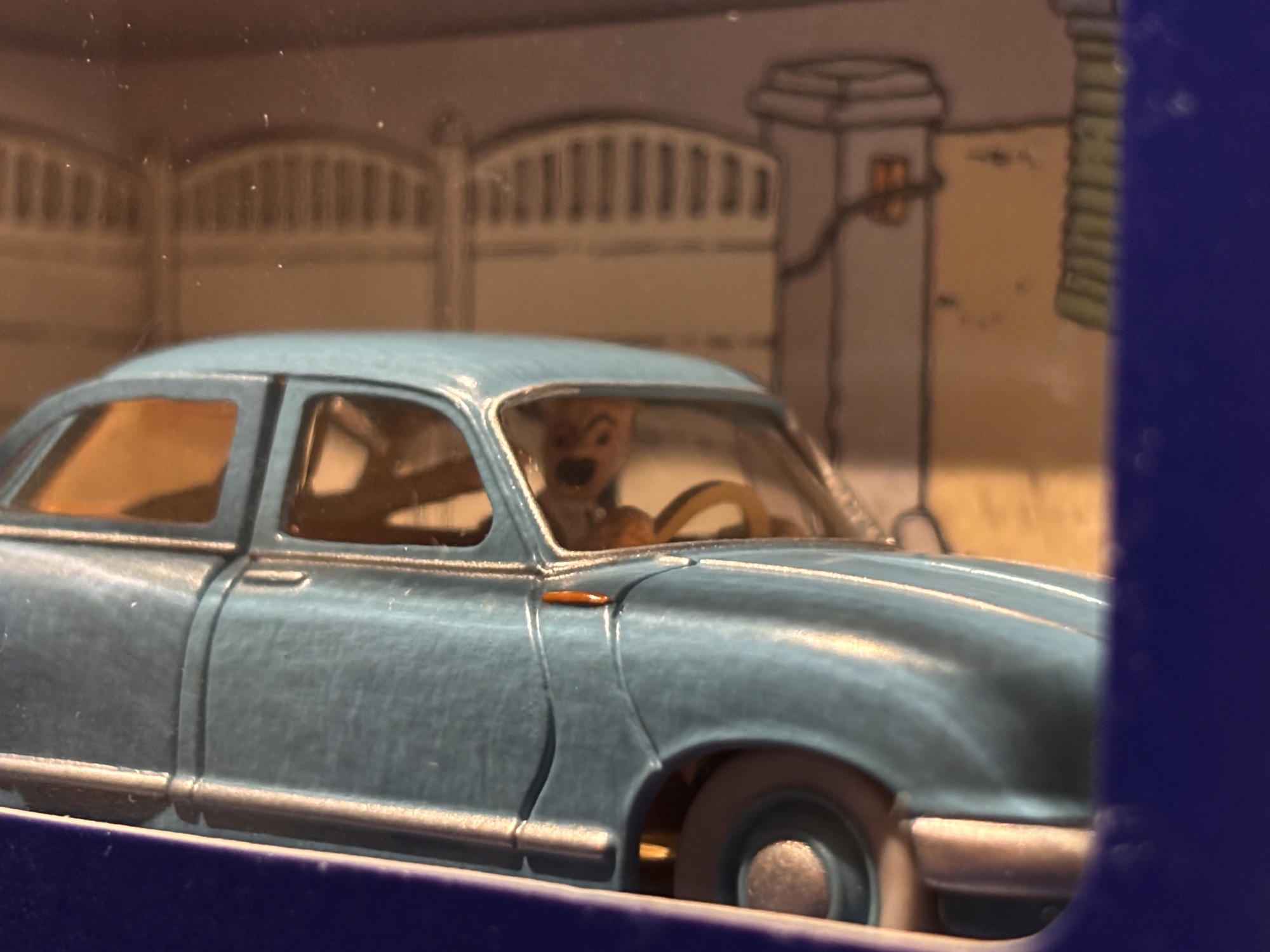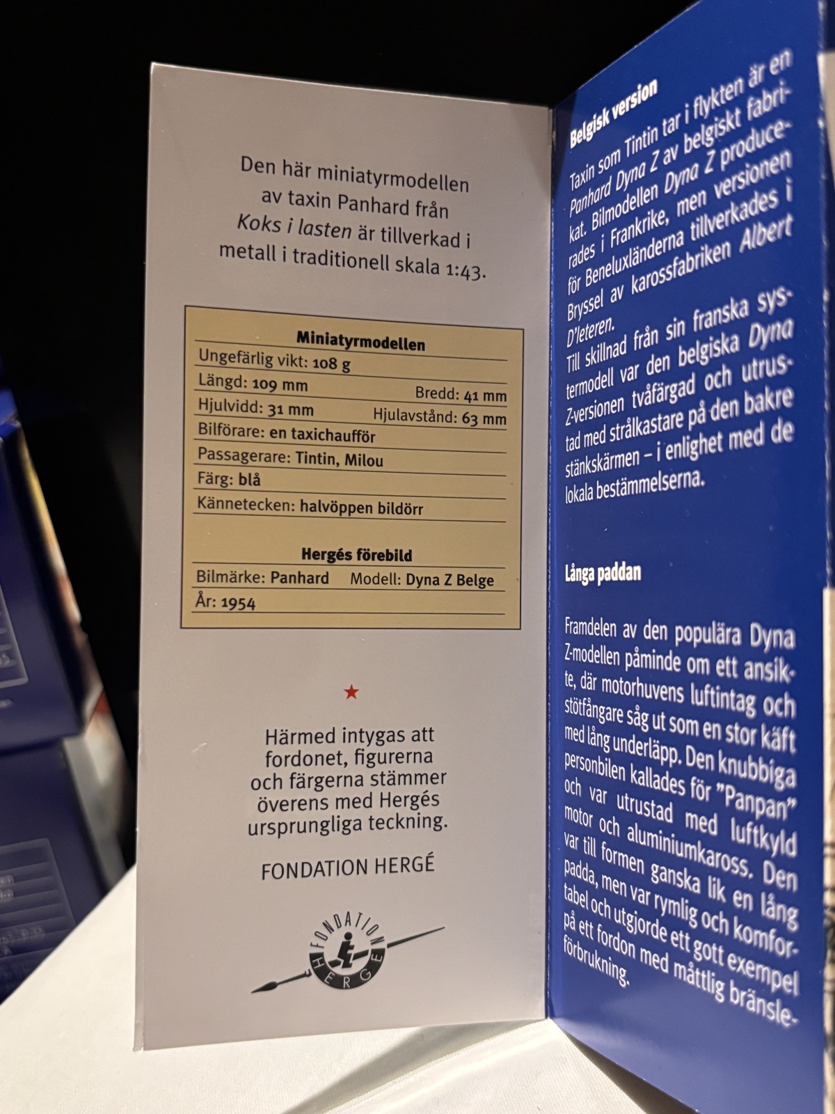 Detaljerad samlarmodell av Panhard Dyna Z, känd från Tintin-albumet ”Koks i lasten” (Coke en Stock). Modellen är en officiell licensierad utgåva godkänd av Fondation Hergé, vilket garanterar att fordonet, färgerna och figurerna följer Hergés originalteckningar.