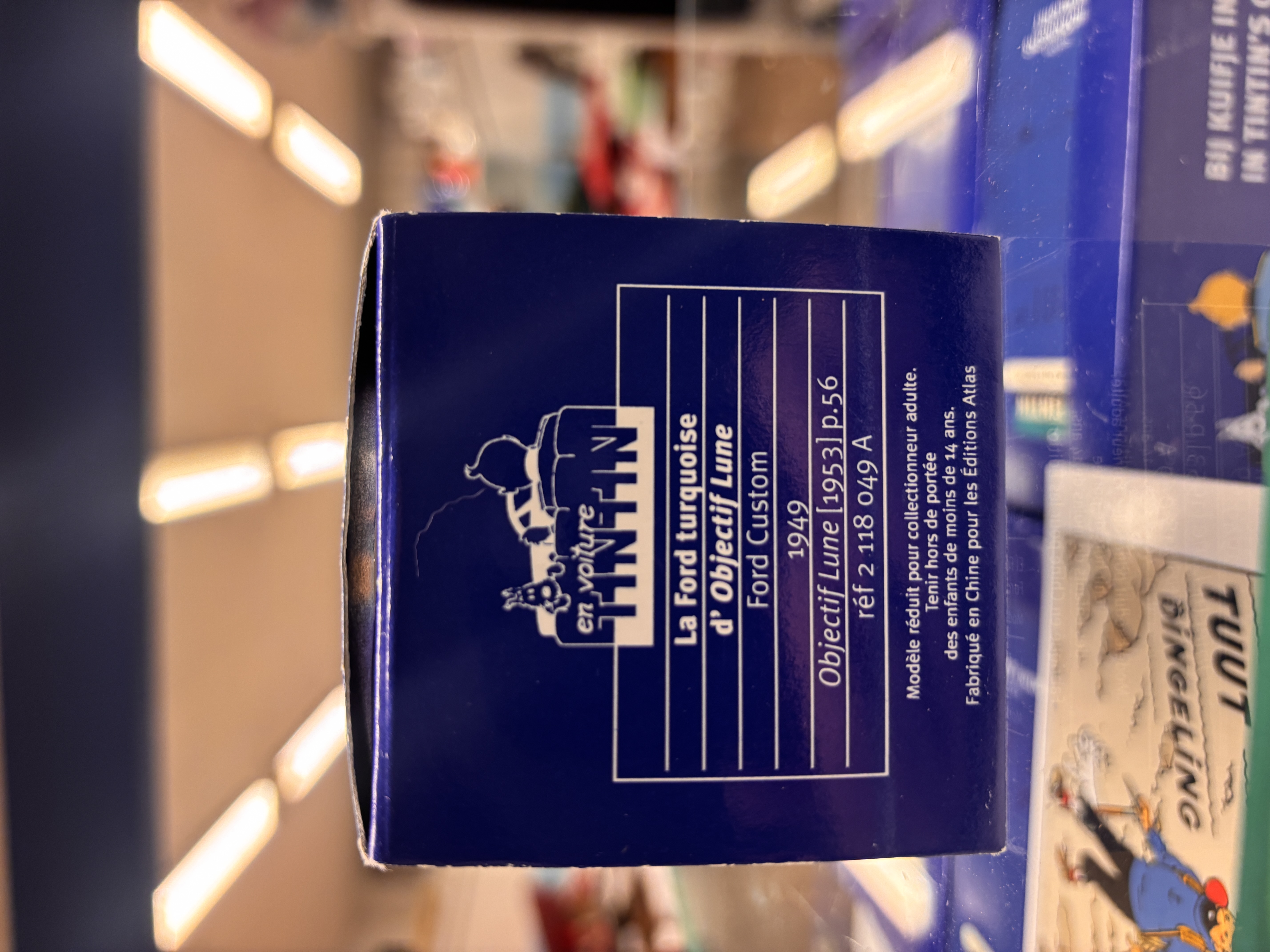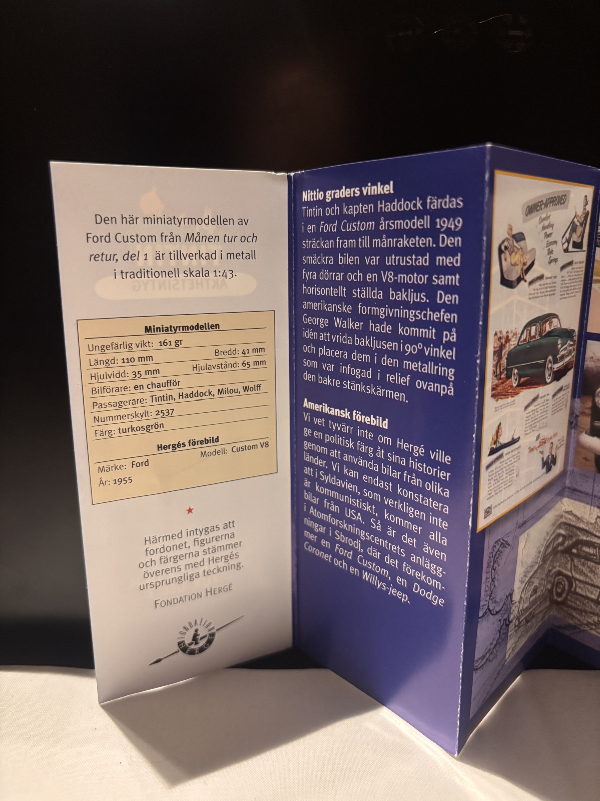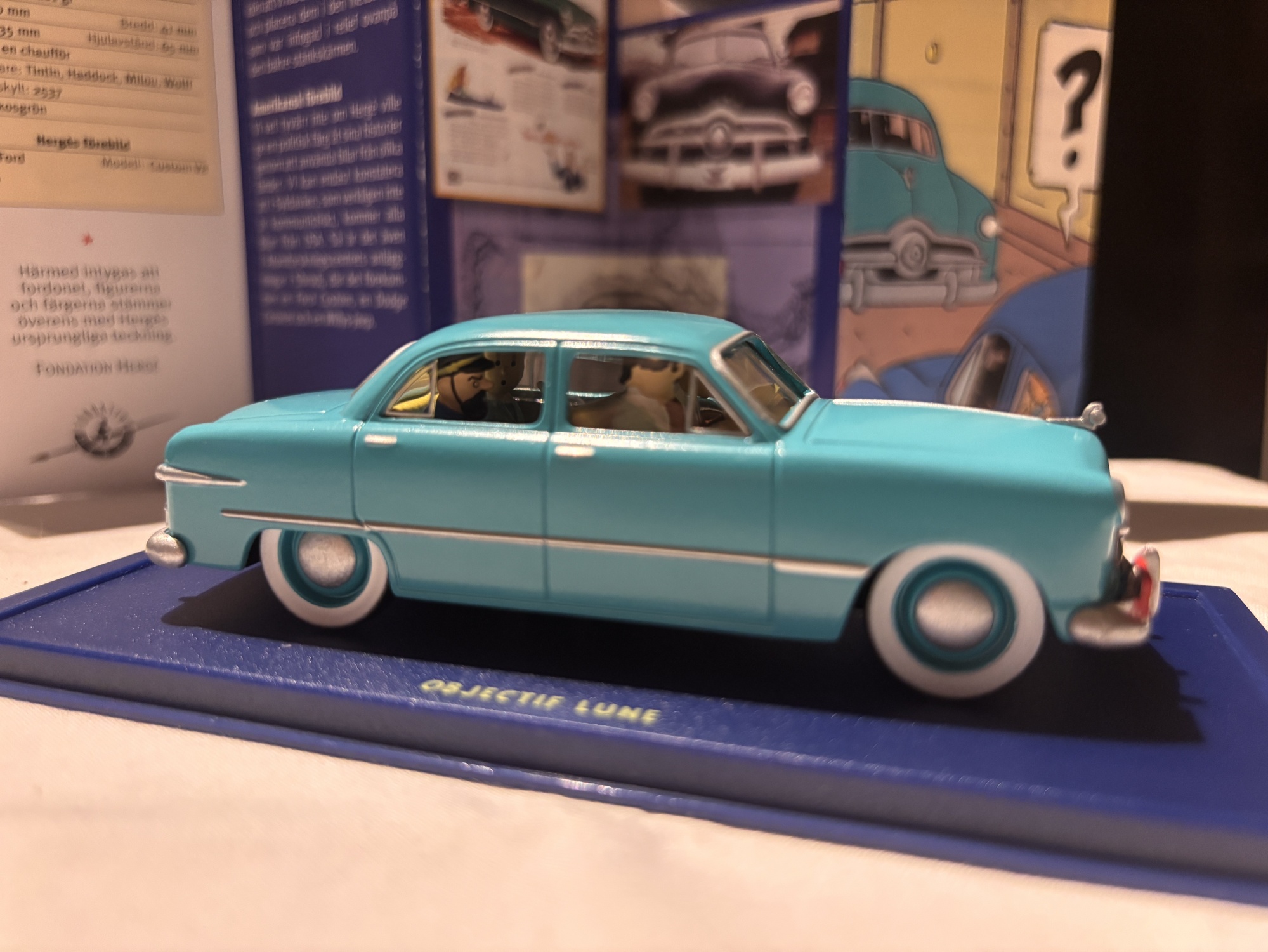 Till salu är denna mycket fina samlarmodell av Ford Custom V8, känd från albumet Månen tur och retur, del 1, där Tintin, kapten Haddock, Milou och Wolff färdas i bilen på väg mot månprojektet. Modellen är tillverkad i metall och återger exakt de färger och detaljer som förekommer i Hergés originalteckningar.