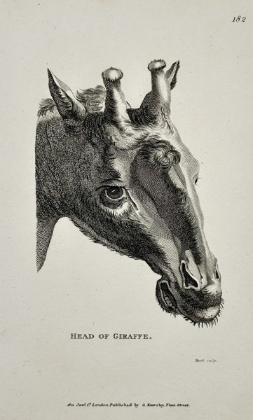 This zoological illustration presents a detailed study of the head of a giraffe, focusing on its unique cranial features. The print captures the large, expressive eye, the textured coat, and the characteristic ossicones or horn-like protuberances atop the head. Published in London at the turn of the 19th century, this work aimed to provide an accurate anatomical record of the species for scientific study, as the giraffe remained a subject of great curiosity and rarity in Europe during this period.