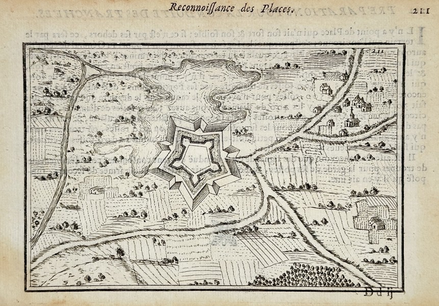 This military engraving provides a topographical study focused on the reconnaissance of a fortified position. The print features a star-shaped bastion fortress at its center, surrounded by a detailed landscape consisting of agricultural fields, winding roads, and a small village with a church. The bird's-eye perspective was a standard convention in 17th-century engineering, designed to illustrate how the geometry of a fortification integrates with the surrounding terrain and lines of approach.