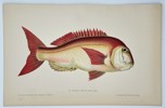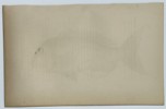 This ichthyological illustration depicts a common pandora, a species of sea bream found in the Mediterranean and Atlantic. The fish is shown in profile against a coastal backdrop of sea and sky, highlighting its characteristic reddish-pink scales and silver underbelly. Published in Paris as part of a significant study on marine life, the print utilizes high-quality color printing to provide an accurate taxonomic record for naturalists and the commercial fishing industry during the late 19th century.