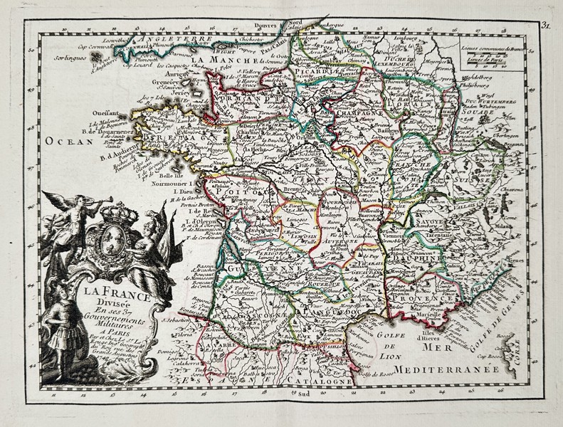 This hand-colored map provides a comprehensive overview of the Kingdom of France during the mid-18th century, specifically organized by its military administrative districts. The work illustrates the country's borders, major river systems, and coastal features, with each of the thirty-seven military governments delineated by colored boundaries. A highly decorative title cartouche is featured in the lower-left corner, incorporating the French royal coat of arms, a winged figure blowing a trumpet, and a soldier in classical armor. The map includes parts of neighboring regions such as southern England, the Netherlands, and the Mediterranean coastline, reflecting the geopolitical context of the era.