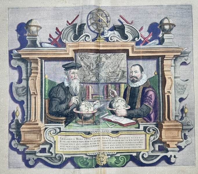 This double portrait depicts two of the most significant figures in the history of cartography, Gerardus Mercator and Jodocus Hondius. The two men are shown seated at a table covered in green cloth, surrounded by the tools of their trade, including globes, dividers, and open atlases. Mercator, on the left, is portrayed as an elder scholar with a long white beard, while the younger Hondius appears on the right. Between them, a small map of the world in two hemispheres is visible. The scene is framed by an elaborate architectural border featuring an armillary sphere, celestial globes, and strapwork ornamentation.