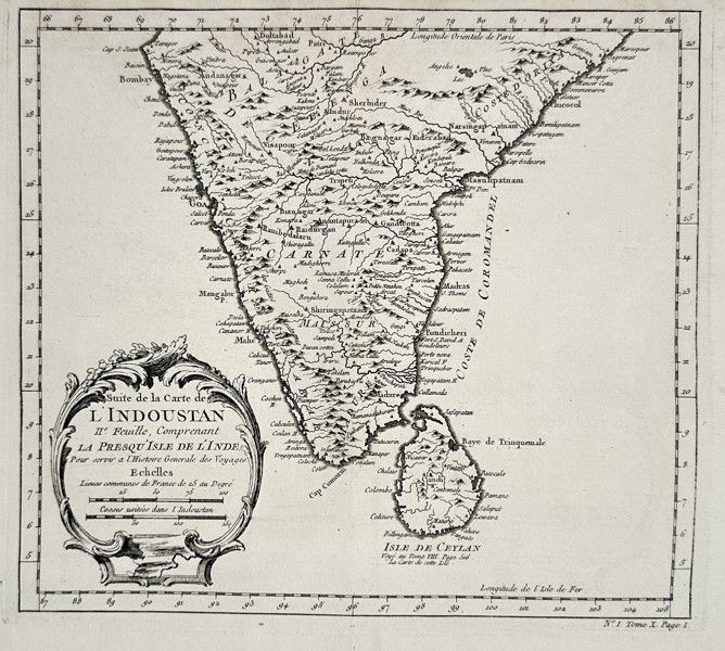 This geographical map depicts the southern portion of the Indian subcontinent, encompassing the Peninsula of India and the island of Ceylon (Isle de Ceylan). The work provides detailed topography of the Carnatic (Carnate), Malabar, and Coromandel coasts, identifying major ports and trading centers such as Goa, Pondicherry, and Madras. The interior is illustrated with mountain ranges and river systems, with various regional kingdoms and territories noted throughout the peninsula. A decorative rococo title cartouche is positioned in the lower-left corner, featuring ornate scrollwork and a foliage motif, and containing mileage scales in French and Dutch units. This illustration was originally published in the "Histoire Generale des Voyages" and reflects the extensive hydrographic records compiled by the French Navy during the mid-18th century.