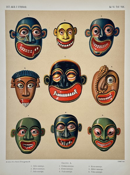 This ethnographic plate presents nine distinct ceremonial masks from Ceylon (modern-day Sri Lanka), systematically arranged and numbered. The collection includes a variety of traditional Sanni and Kolam masks, characterized by their vibrant colors and exaggerated features such as bulging eyes, prominent teeth, and dynamic facial expressions. Each mask is meticulously rendered to show the specific details of its construction, including carved animal motifs—such as the cobra depicted on mask number six—and stylized hair or headpieces. These masks were used in ritual healing ceremonies and traditional folk theater to represent different diseases, demons, or mythological characters. This work was published as part of a scholarly series in the Internationales Archiv für Ethnographie to document the material culture of South Asia for a European audience.