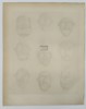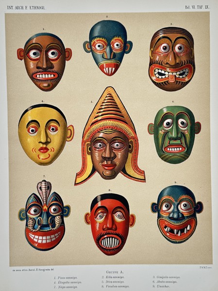 This ethnographic plate presents nine distinct ceremonial masks from Ceylon (modern-day Sri Lanka), systematically arranged and numbered. The collection includes a variety of traditional Sanni and Kolam masks, characterized by their vibrant colors and exaggerated features such as bulging eyes, prominent teeth, and dynamic facial expressions. Each mask is meticulously rendered to show the specific details of its construction, including carved animal motifs—such as the cobra depicted on mask number six—and stylized hair or headpieces. These masks were used in ritual healing ceremonies and traditional folk theater to represent different diseases, demons, or mythological characters. This work was published as part of a scholarly series in the Internationales Archiv für Ethnographie to document the material culture of South Asia for a European audience.