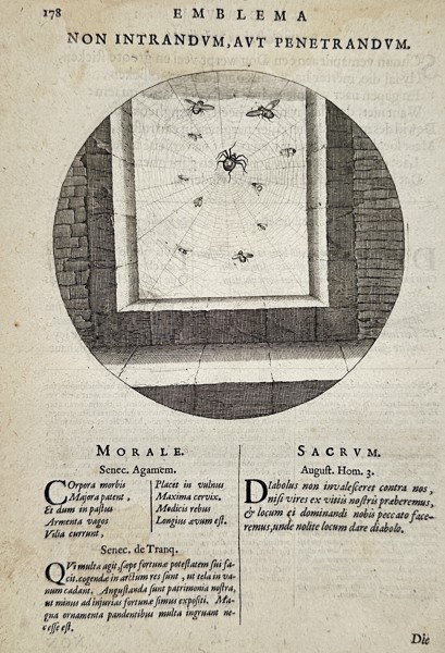 This circular emblem illustrates a moral lesson through the image of a spider in its web. The engraving shows a spider positioned at the center of a complex, radiating web spun across a stone window frame. Several flies are caught in the silk, while others hover nearby. Below the illustration, the page is organized into two columns of text. The left column, labeled Morale, features philosophical reflections from Seneca’s Agamemnon and De Tranquillitate Animi in Latin. The right column, labeled Sacrum, contains a religious commentary citing Augustine and a verse from the Book of Proverbs in French. This work uses the metaphor of the spiderweb to provide ethical and spiritual guidance, warning the viewer about the traps of vice and the necessity of either avoiding temptation or having the strength to overcome it.