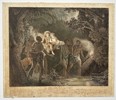 This narrative engraving illustrates a dramatic scene from the celebrated novel Paul et Virginie by Jacques-Henri Bernardin de Saint-Pierre. The composition depicts a nighttime passage through a tropical forest, where the two young protagonists, Paul and Virginie, are being carried across a shallow stream. They are seated upon a makeshift litter borne by two local men, one of whom holds a flaming torch that illuminates the dense foliage and gnarled trees.