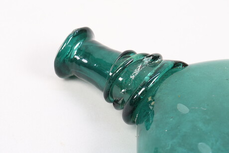 Flaska, 1900-tal, gröntonat glas, puntlad med driven mynning, slinga runt halsen, höjd 23,5 cm