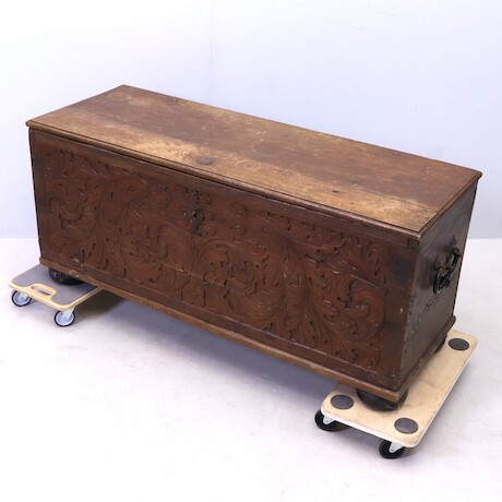 Bilder Kista, allmoge skuren floral dekor. Rokokostil. 1800-talets början. Fungerande original lås med nyckel. 132 X 50 X 60 cm