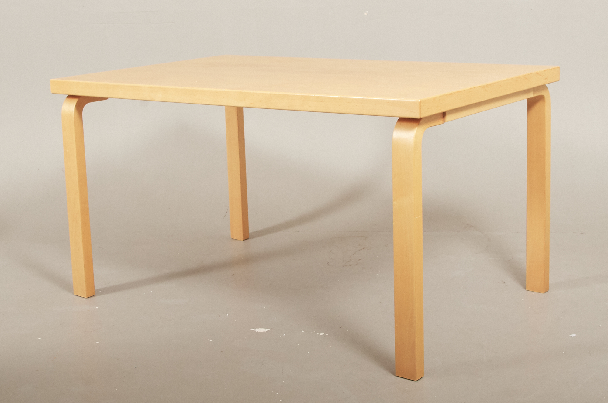 Lackerad björk, etikettmärkt, 135 x 85 cm, höjd 72 cm, smärre bruksslitage, men skiva med fläckar.