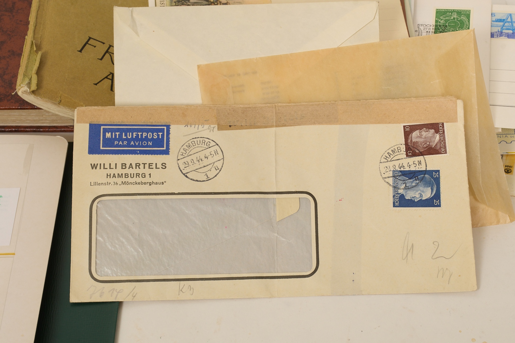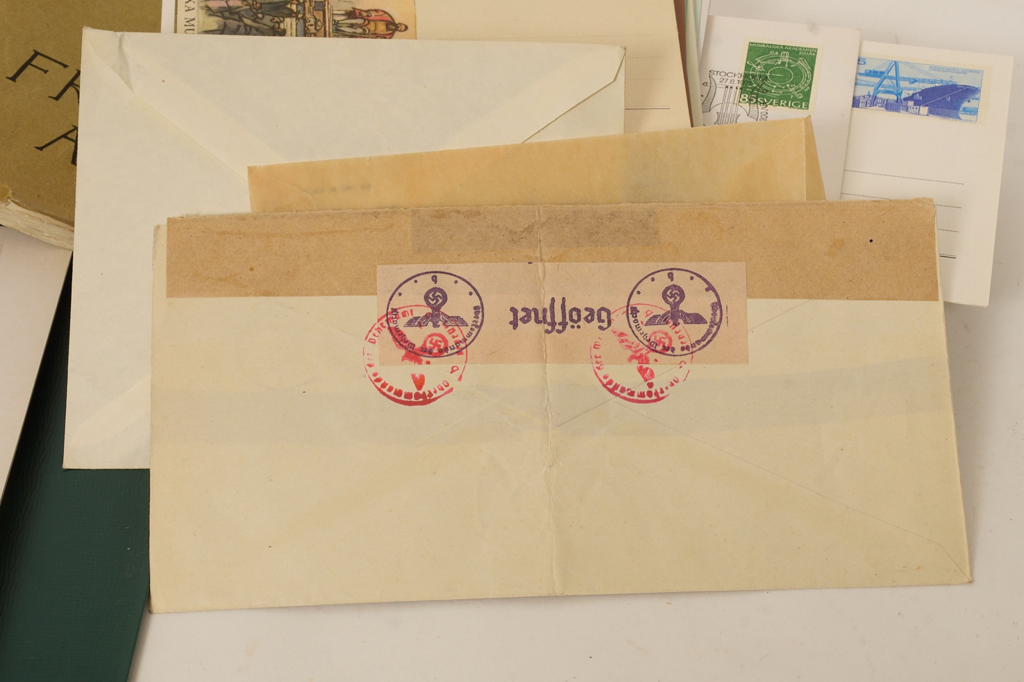 Bl.a. 5 st rabatthäften, gäller hela Norden, tyskt censurbrev, vykort, brev, div. utlandet m.m.