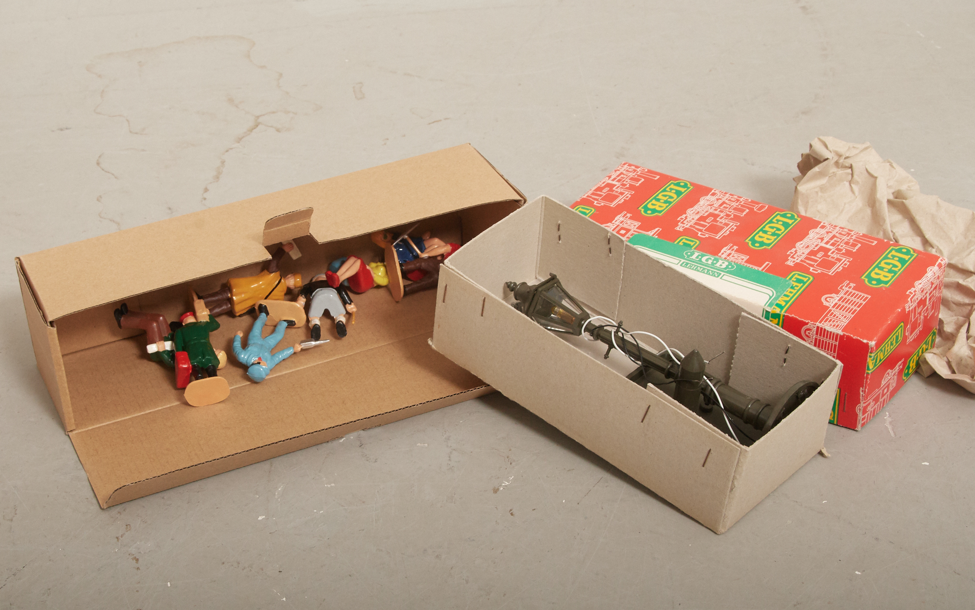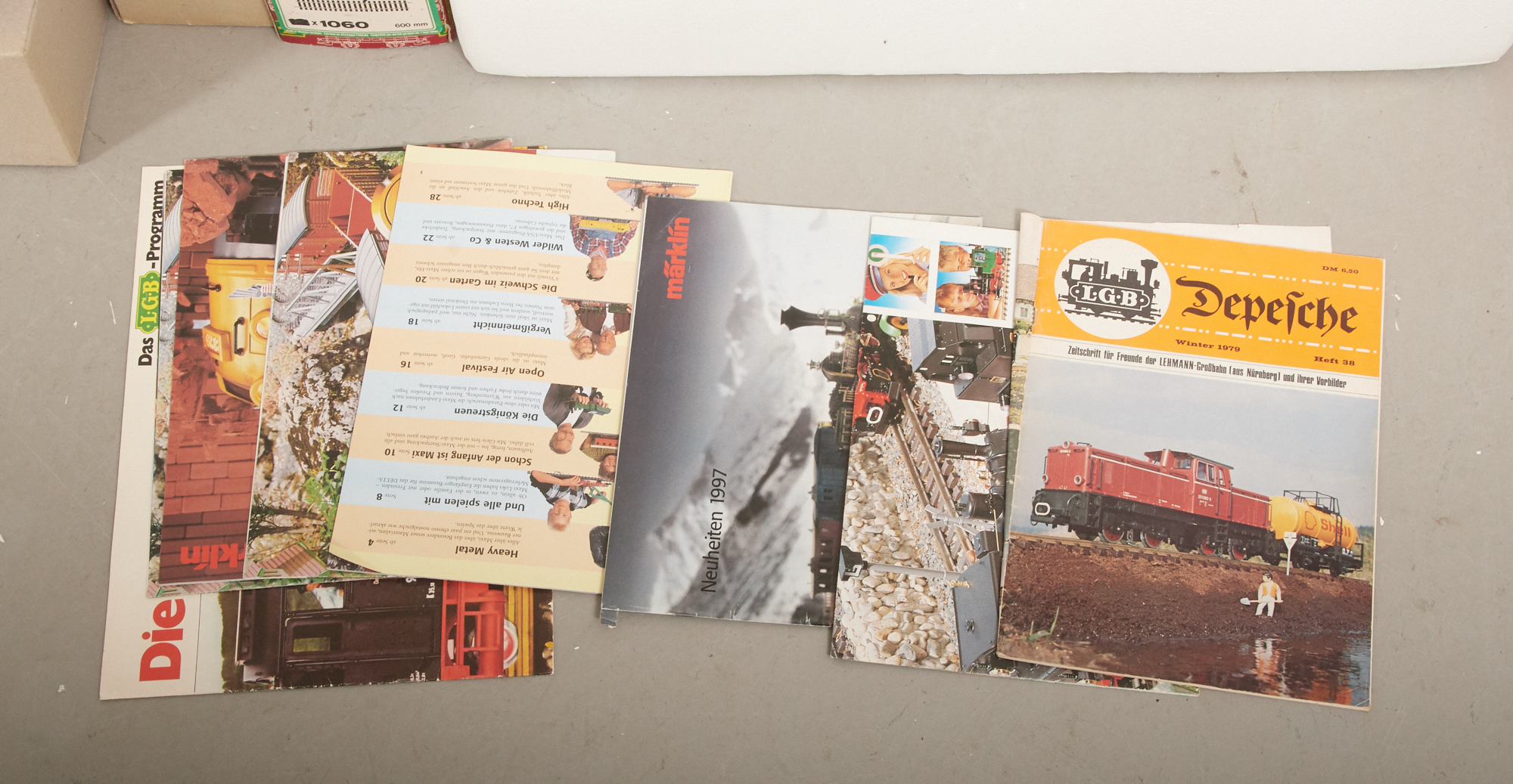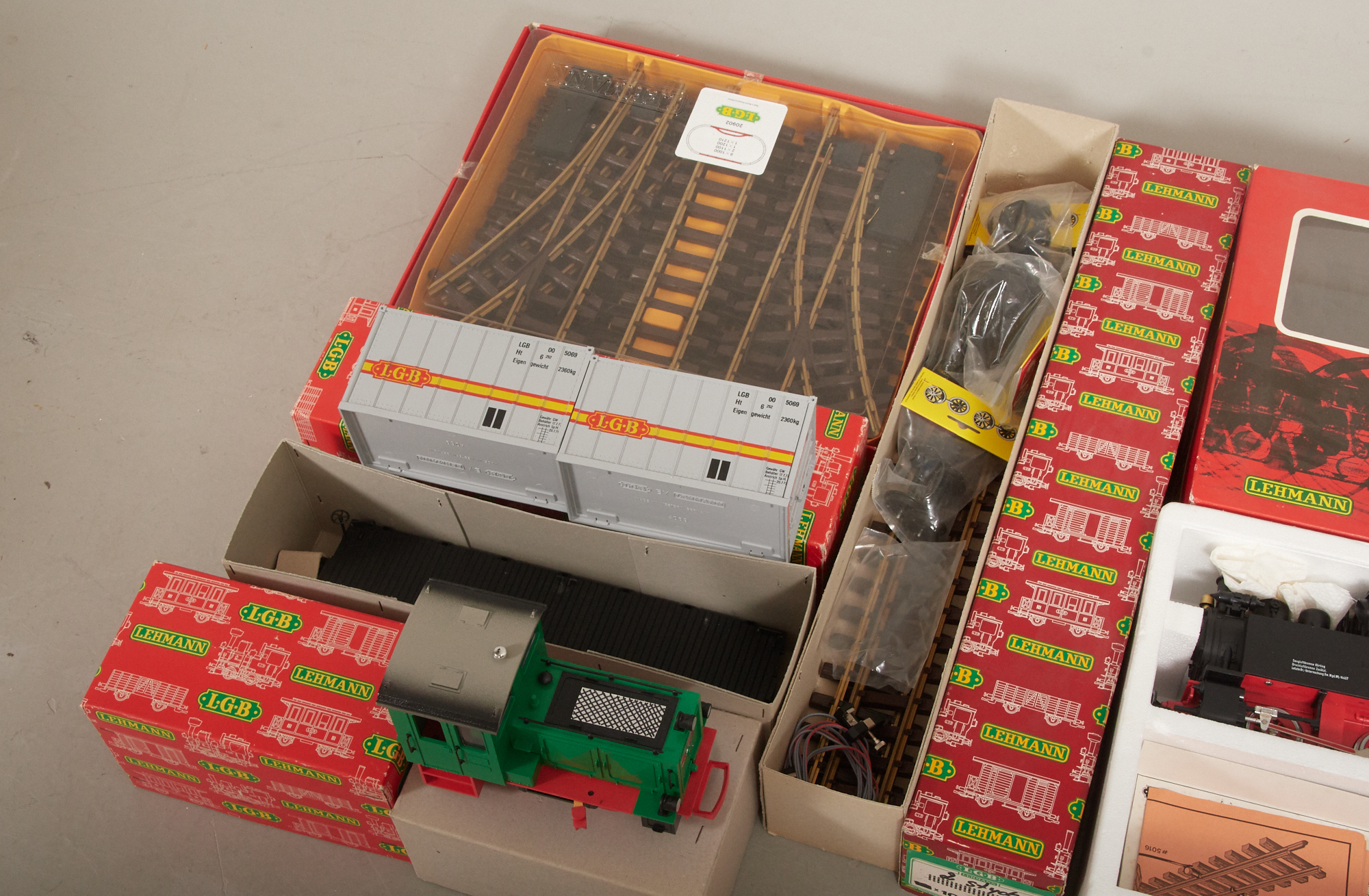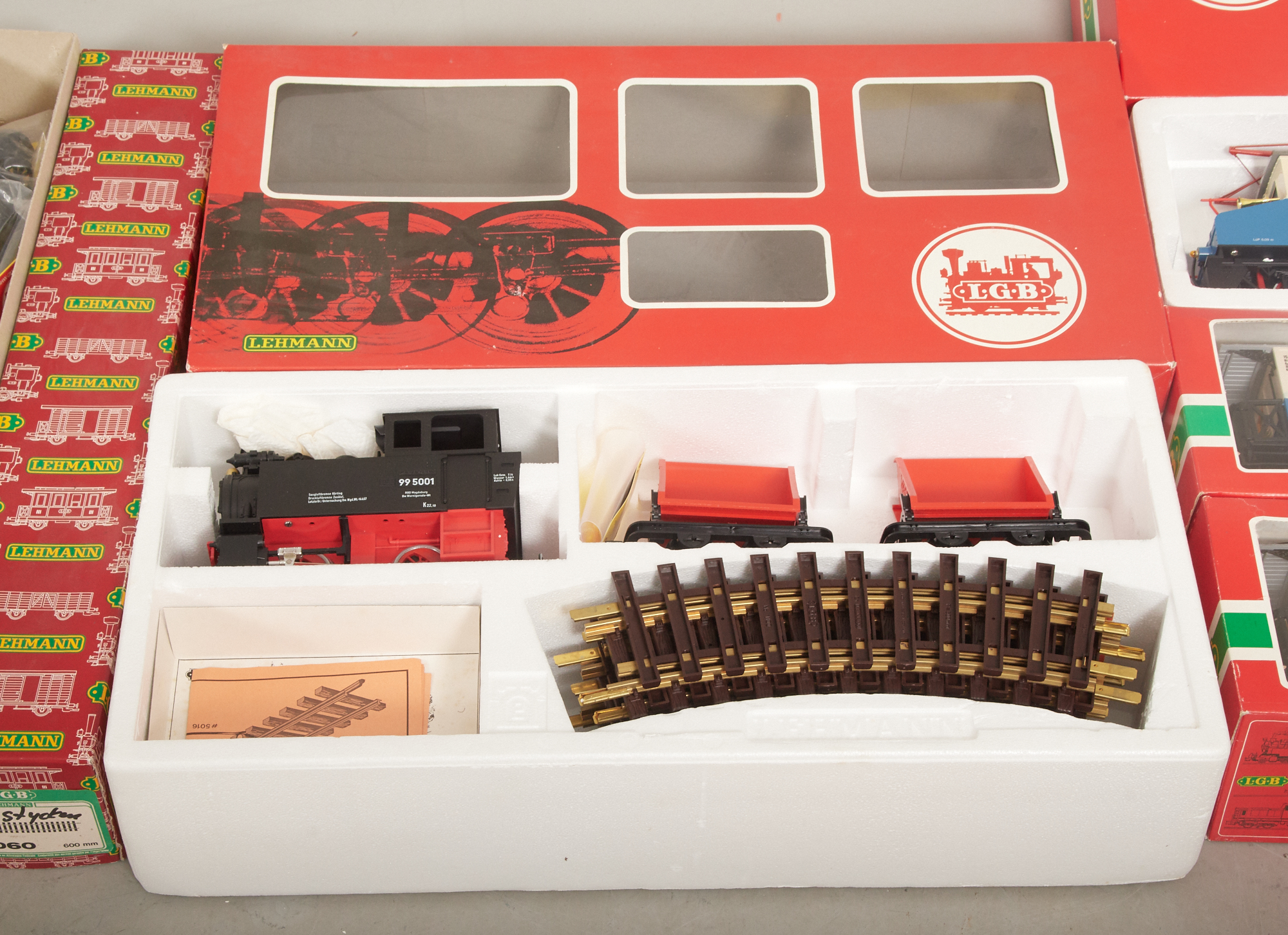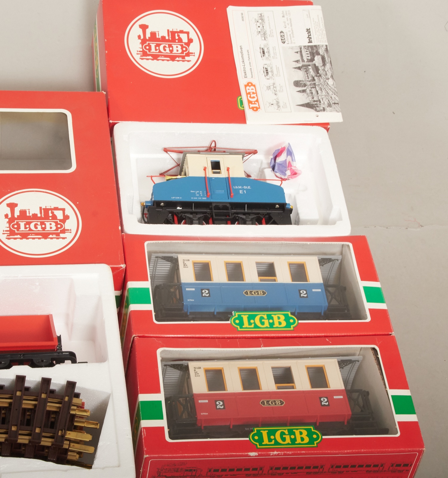 LGB Lehman, tågsats 20601T, saknar trafo, lok 2030E, lok 209, vagnar 3014, 3007, 4069, skenor 20902, 1060 endast 2 skenor. Stolpar 5054, div. folk, broschyrer, allt i originalkartonger, förefaller oanvänt.