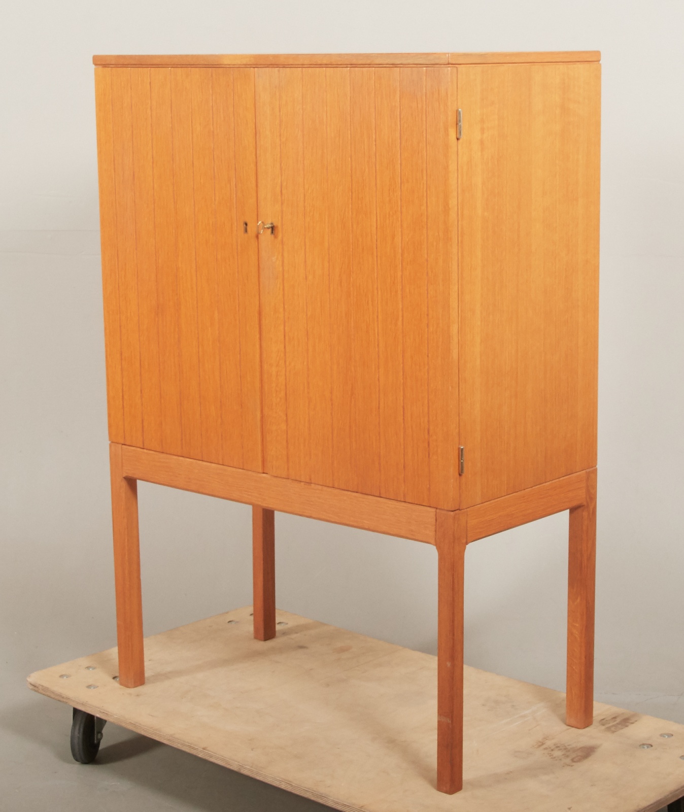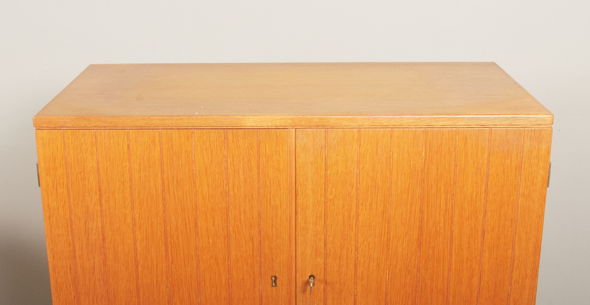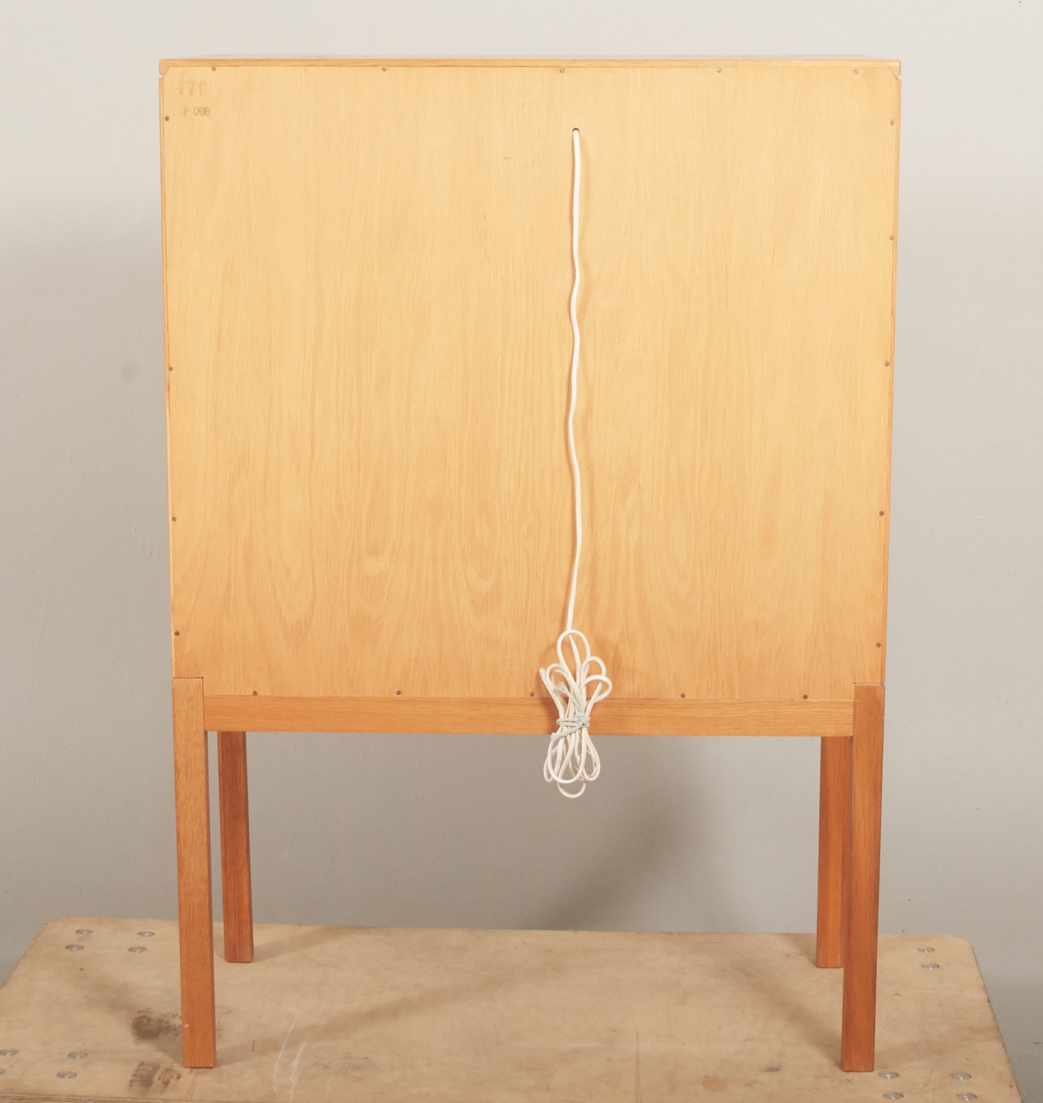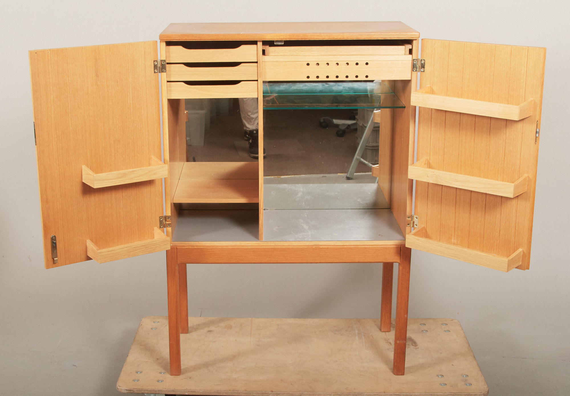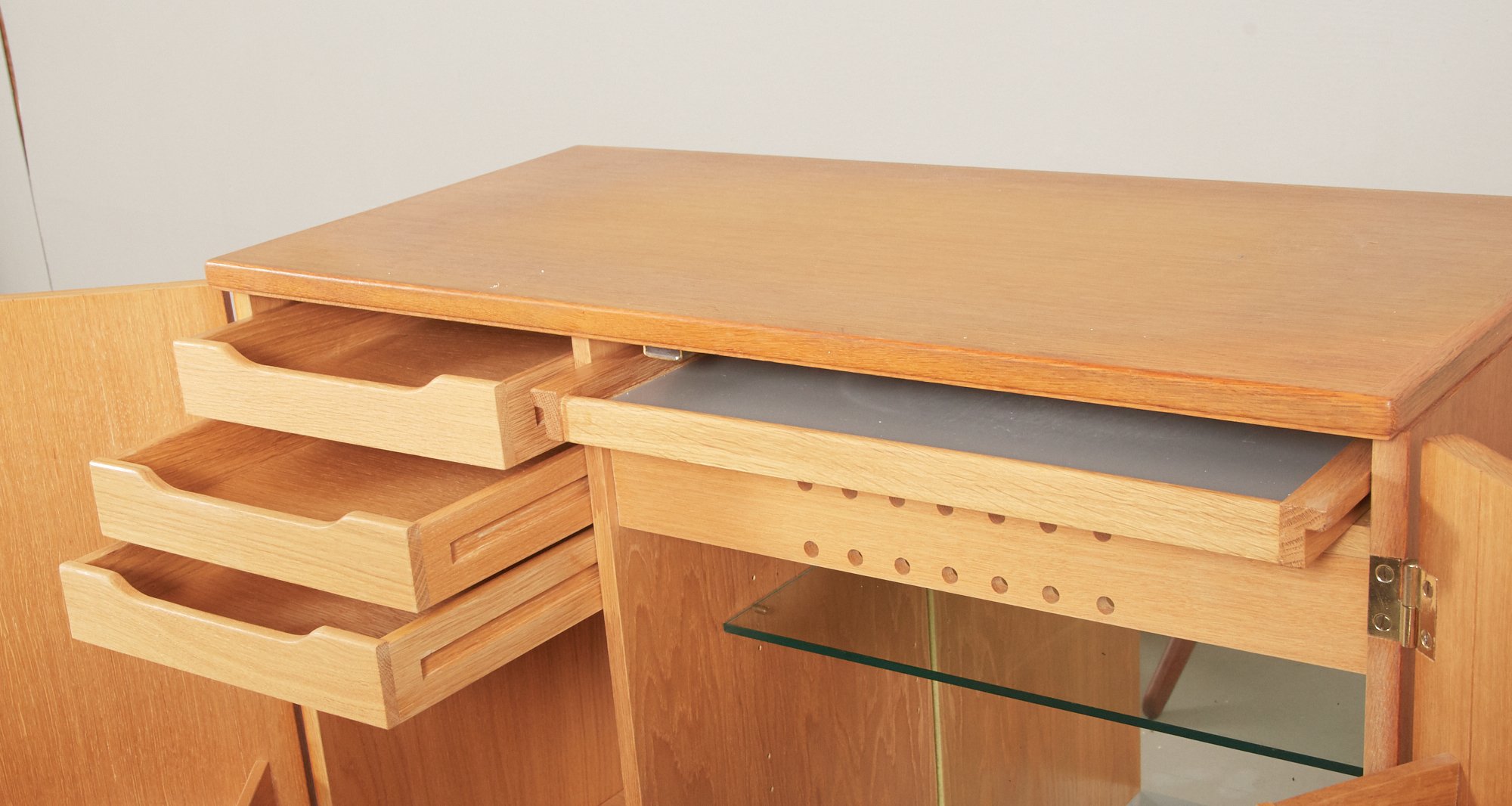 1960-tal, massiv ek, inredning med glashyllor, lådor och fack, samt belysning.