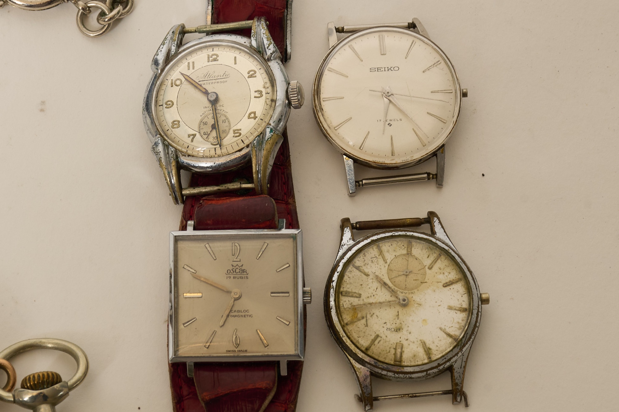4 st, Seiko, Atlantic, Oscar, mm, defekta ur, Omega samt Longines fickur, samt en st mormorsur, Longines går vid enklare test