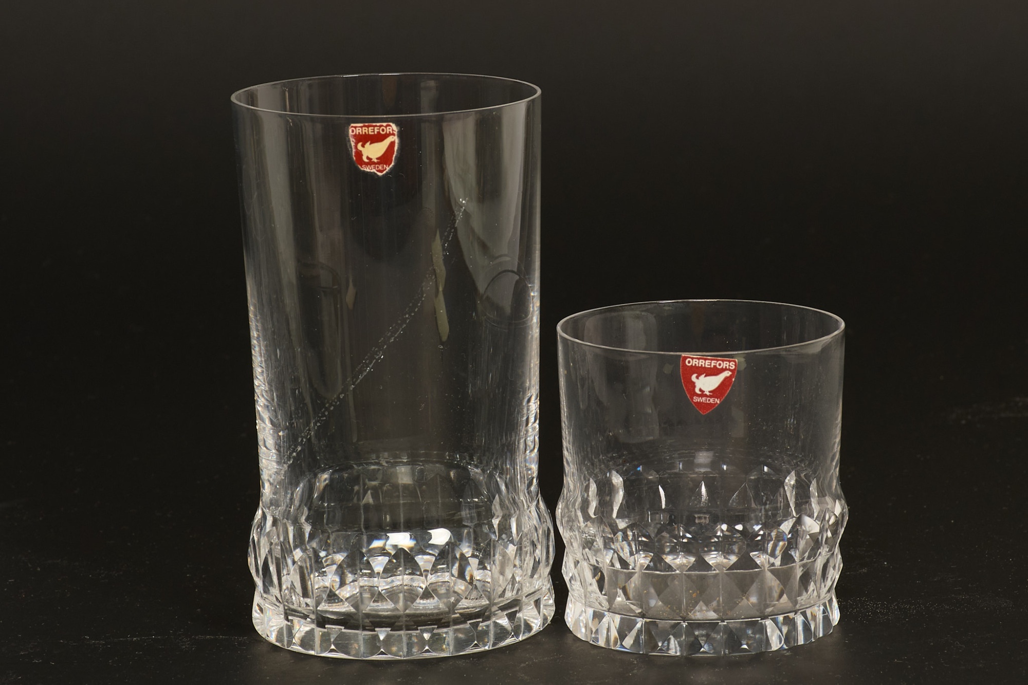 12 grogglas, höjd 12 cm, 12 selterglas, höjd 7 cm, flertal etikettmärkta, smärre bruksslitage.