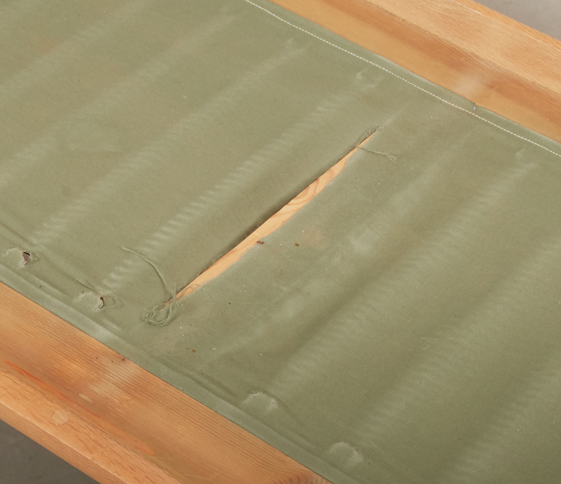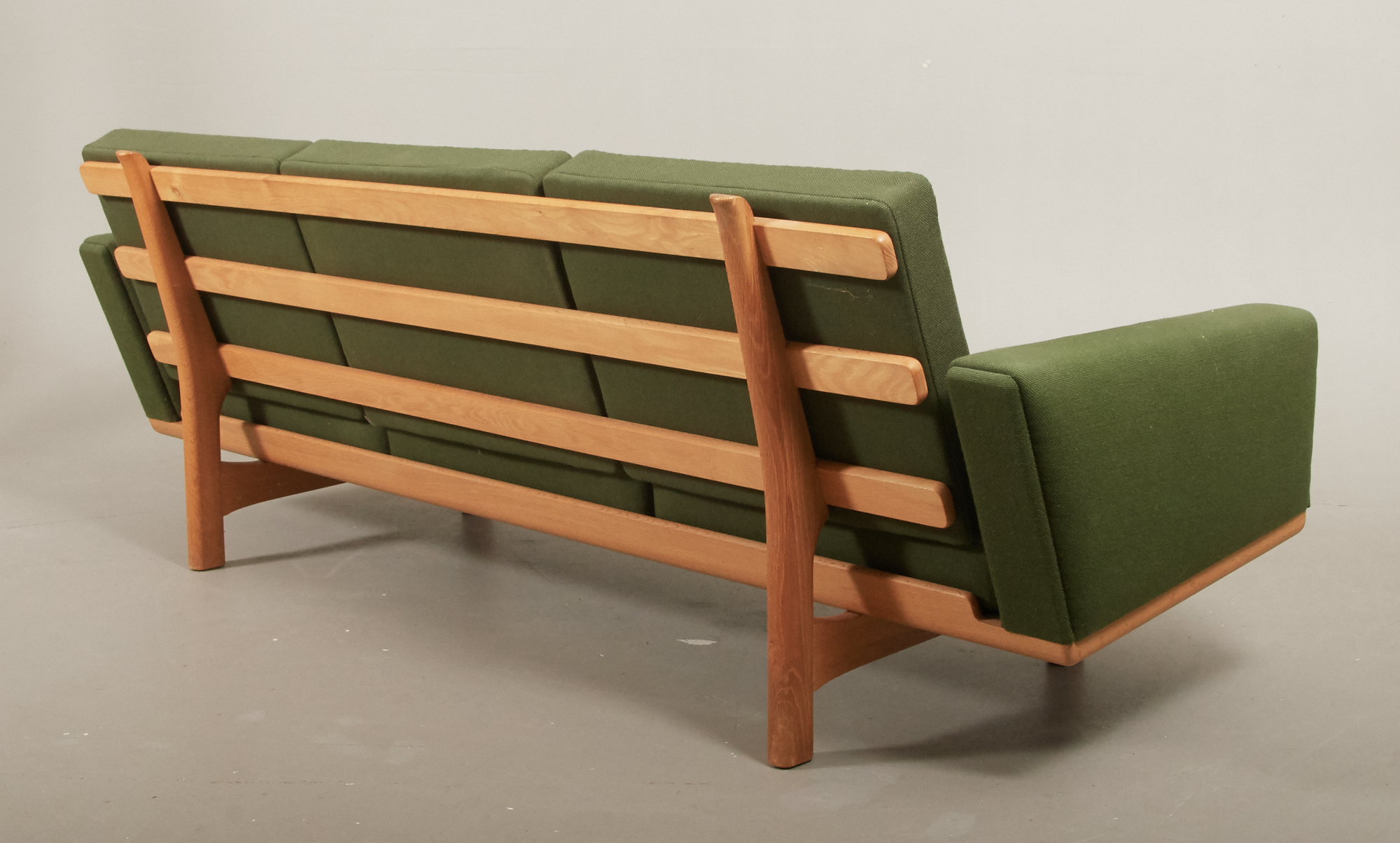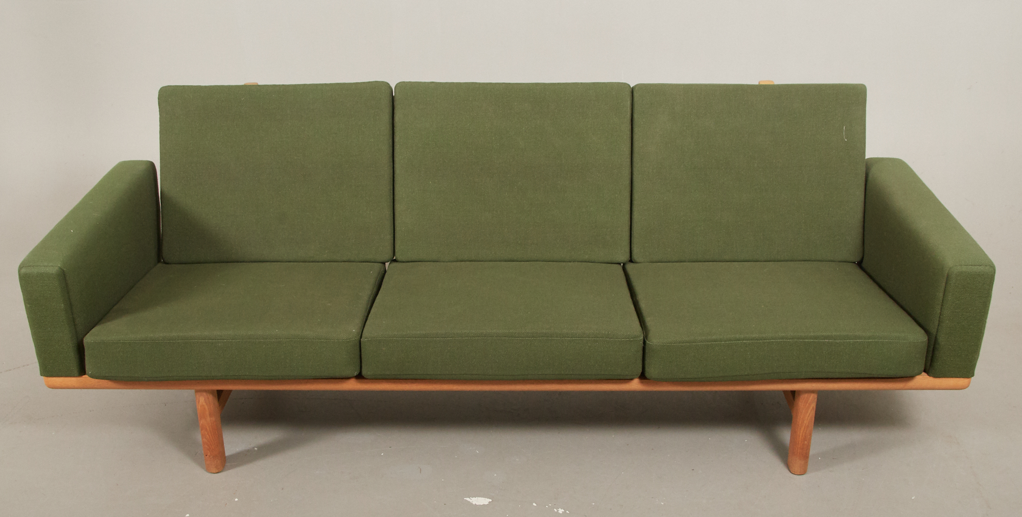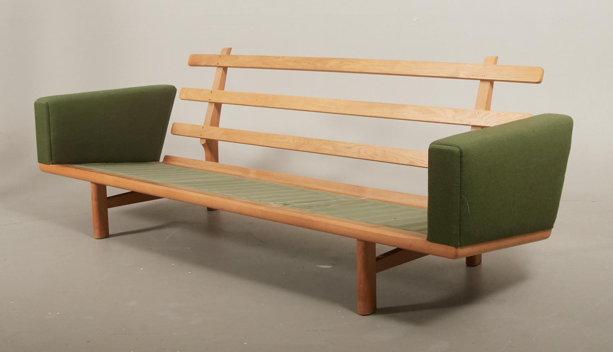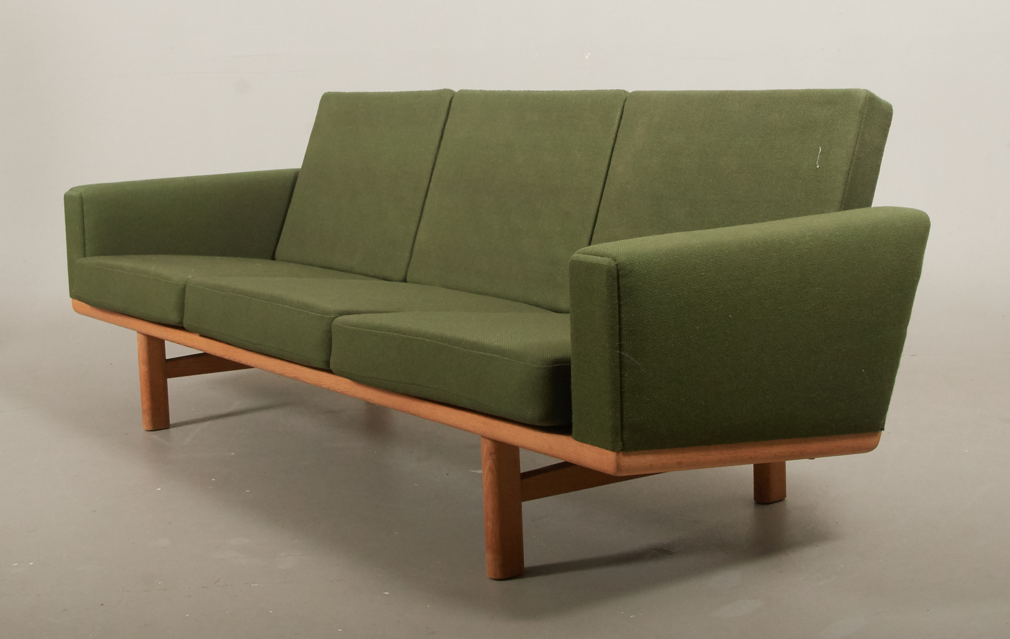 Modell GE-235, ek klädd i grönt ulltyg. Längd 210 cm, djup 80 cm. Bruksslitage, reva i tyg stomme.