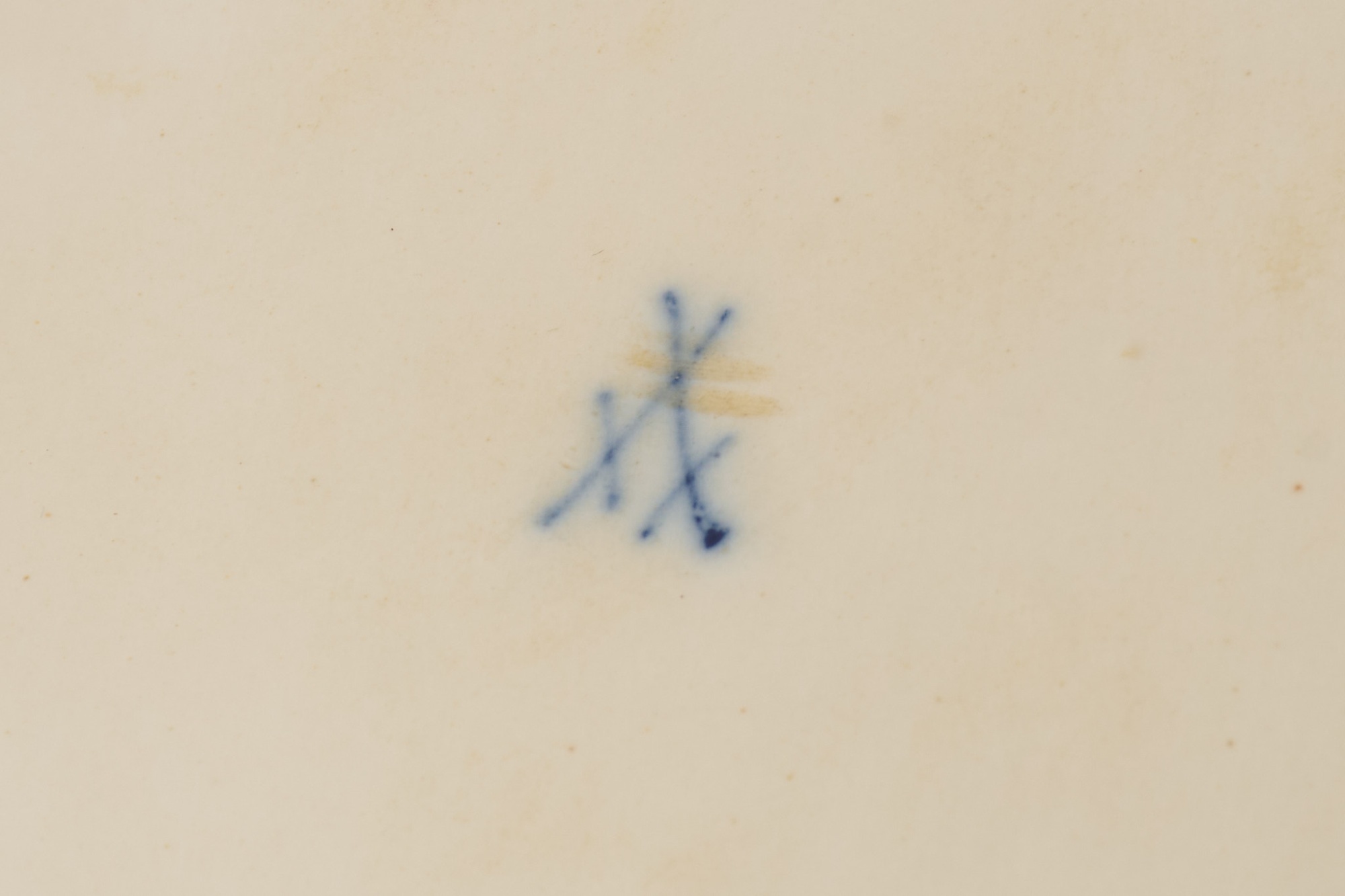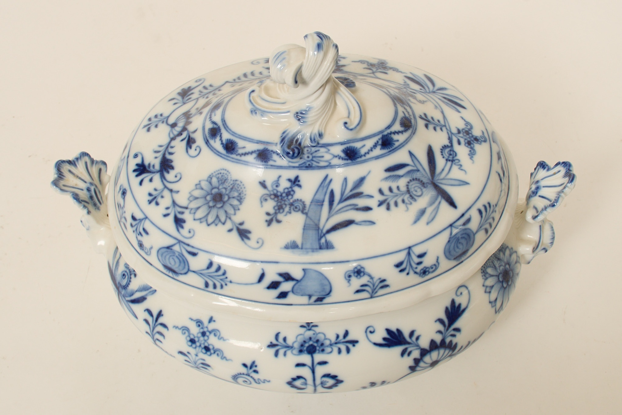 Dekor av lökmönstret och märkt med fabriksmärket i underglasyrblått. Längd ca 32 cm, höjd 23 cm. 2:a sortering. Bruksslitage