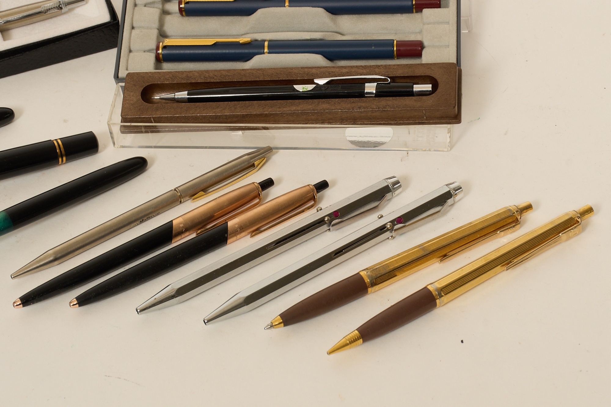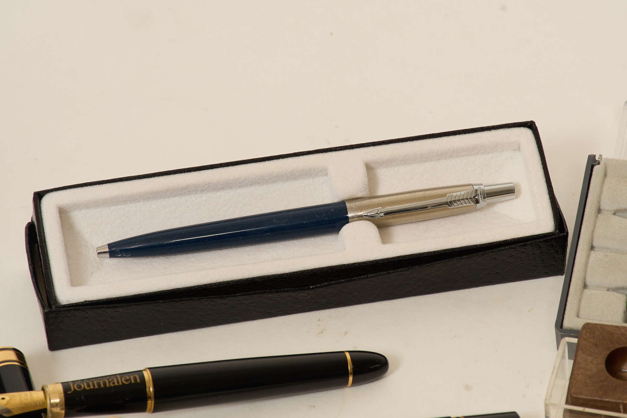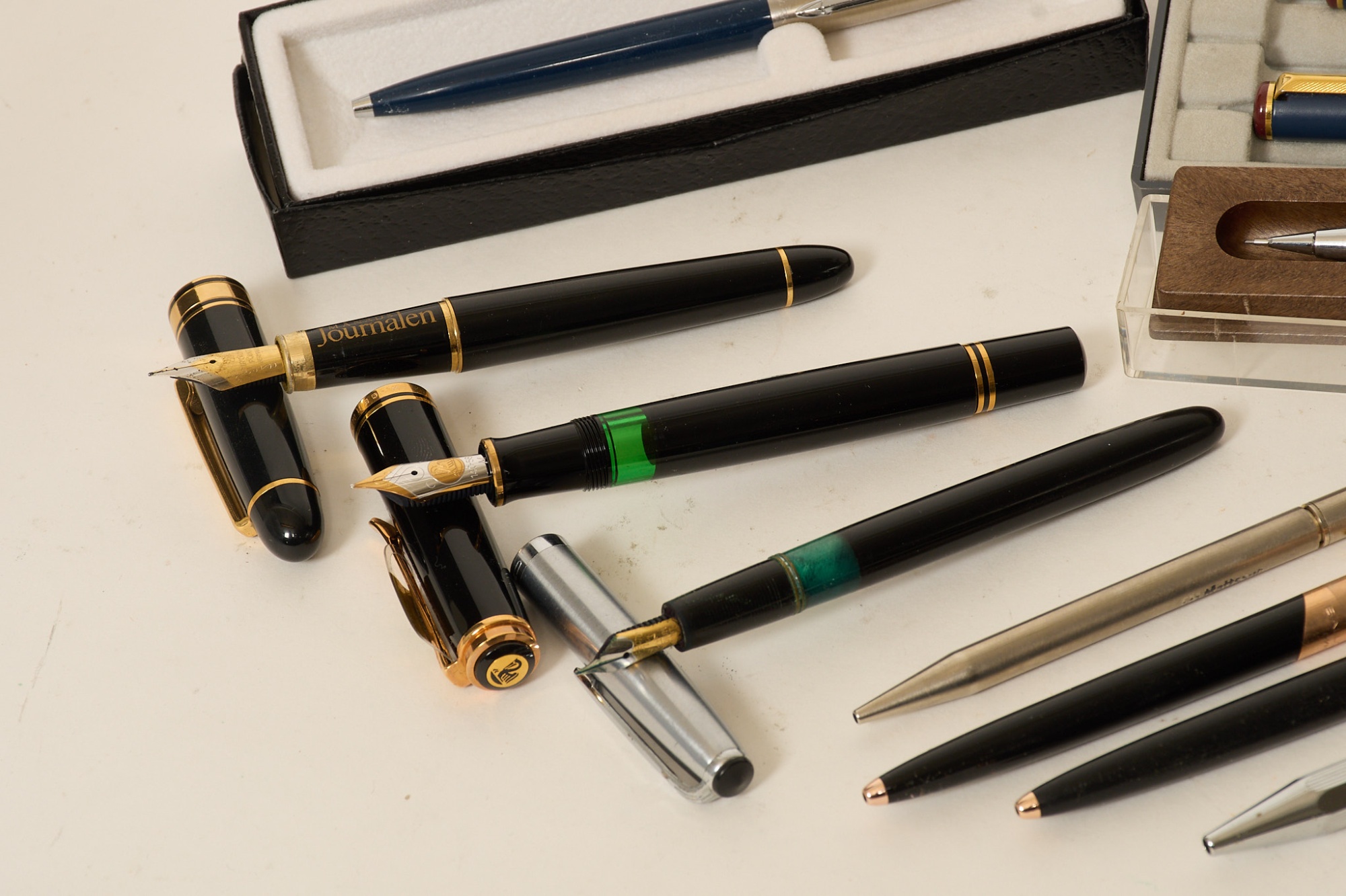 3 st Parker, varav en reservoarpenna, 1 st Pelikan reservoar i nyskick, 1 st Perfecto reservoar, 4 st Ballograf, 1 st Chromatic, 1 st Pilot mm