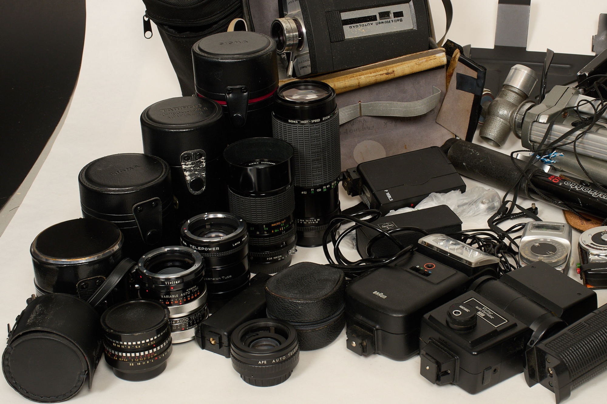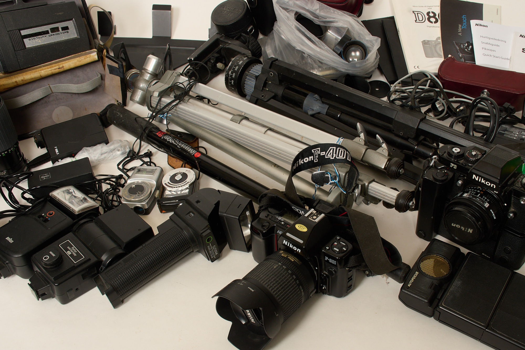 Nikon FE, Nikon AF F-801, objektiv DX 18-135 mm. Bell Howell super 8 polaroid, 3 stativ, filter mm