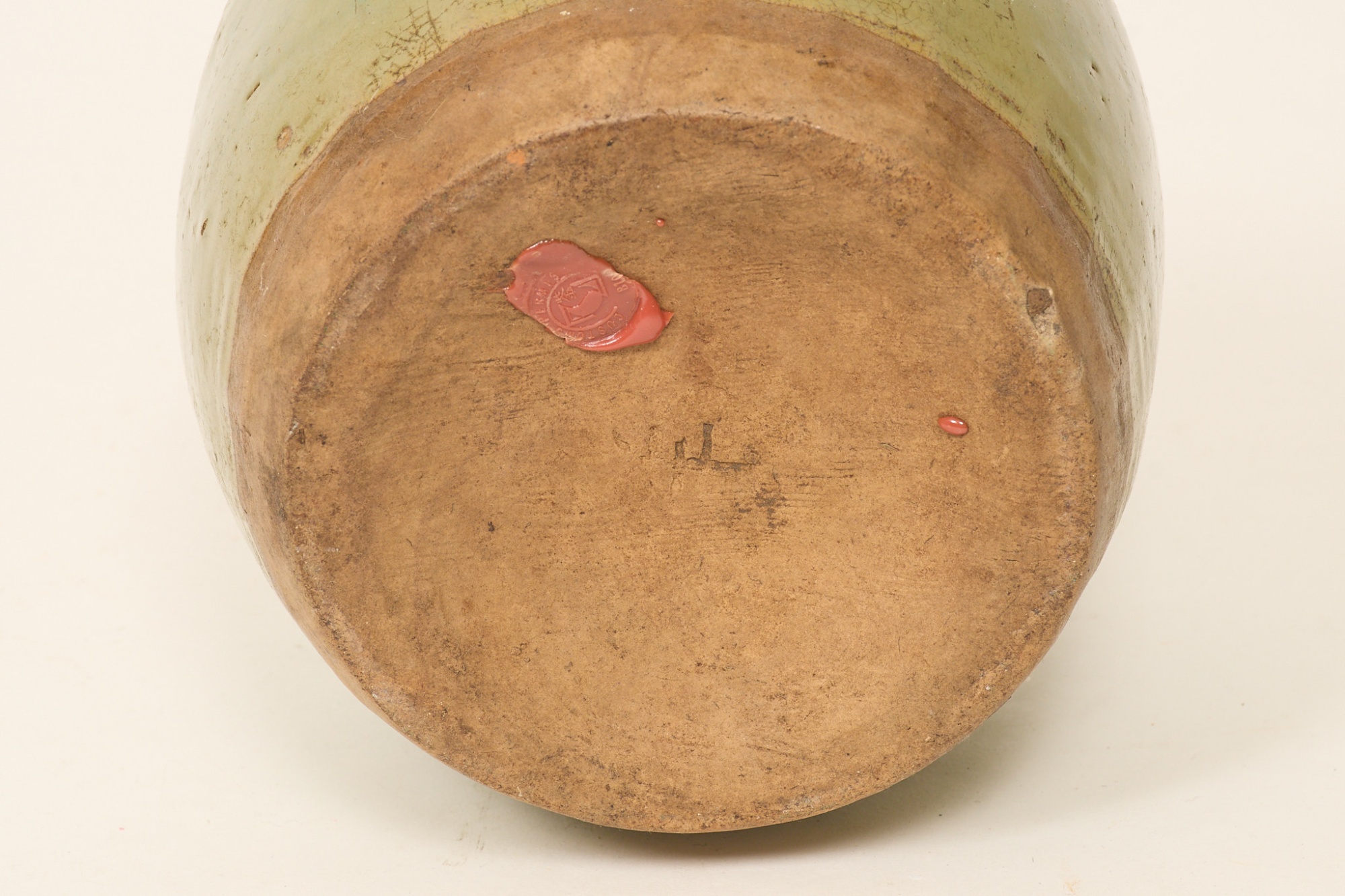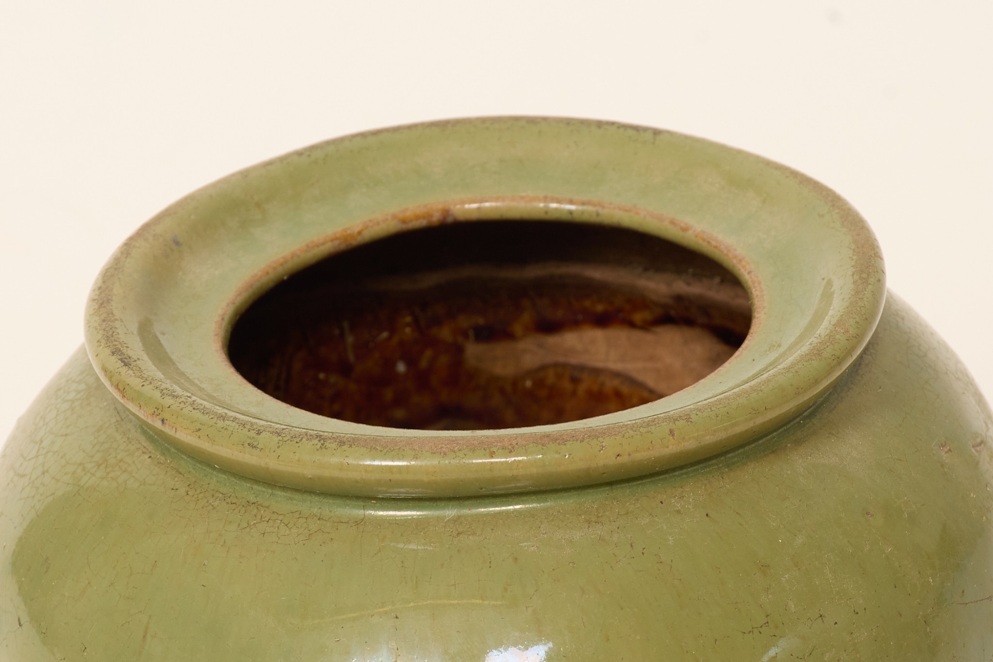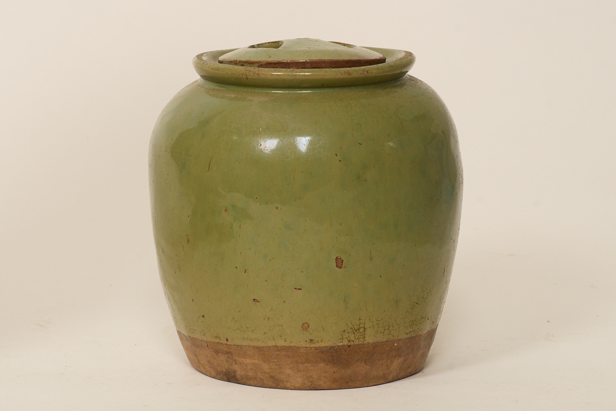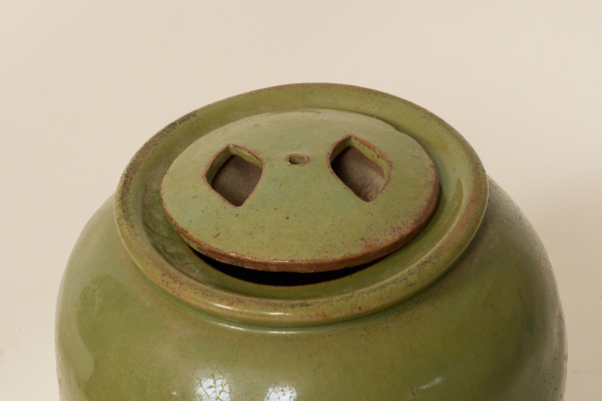 Celadonglasyr, höjd 17 cm, lock med mindre nagg i underkant, slitage.