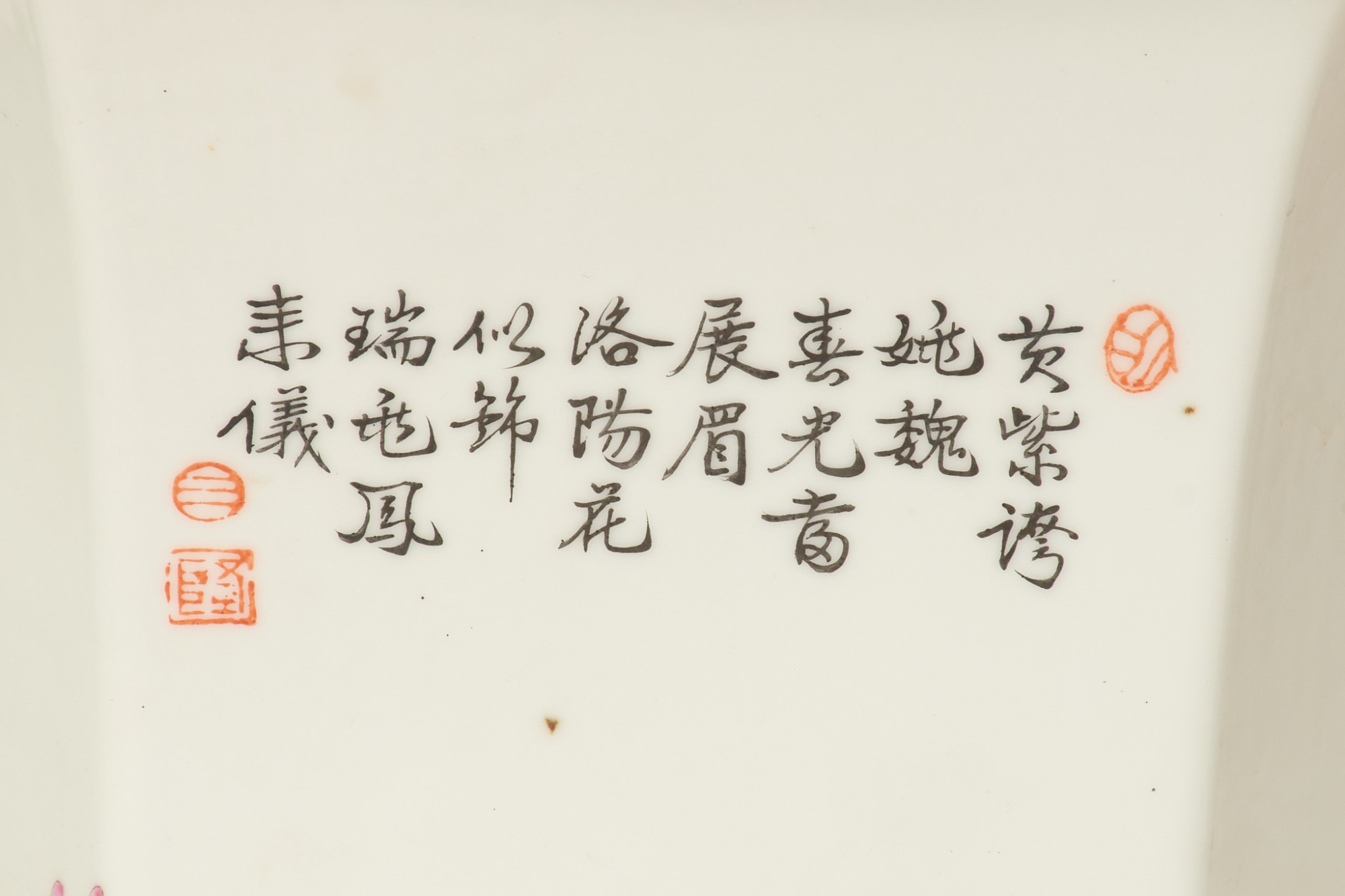 1900-talets andra hälft, med underfat, hexagonal form, polykrom dekor med bl.a. fenixfågel, höjd inkl fat 22 cm, smärre bruksslitage, men stjärnspricka i botten på ytterfoder.
