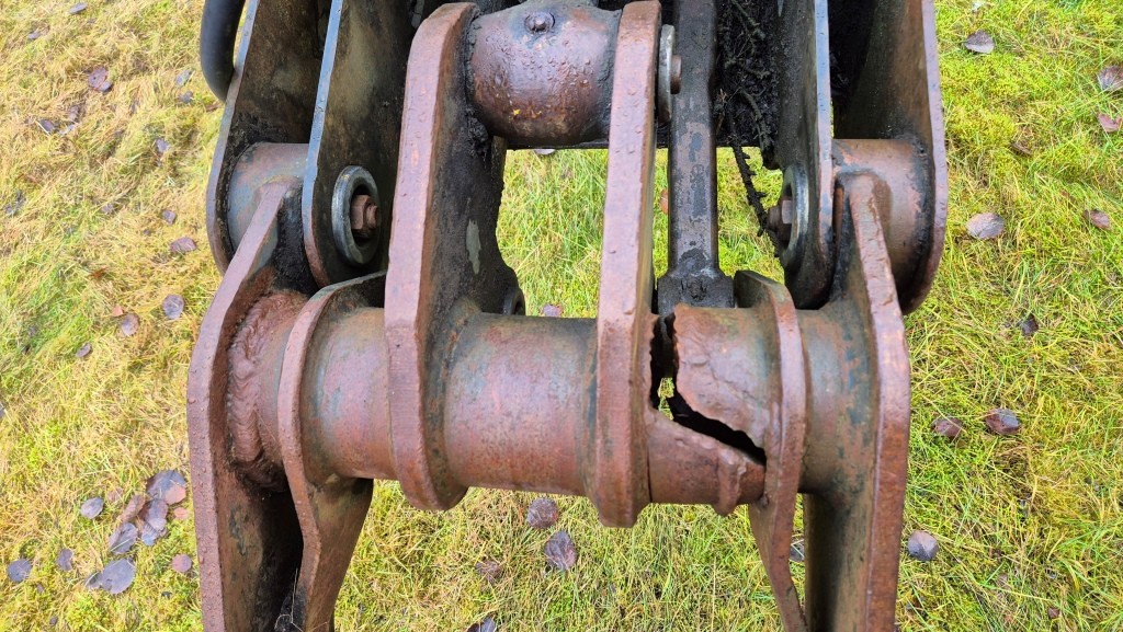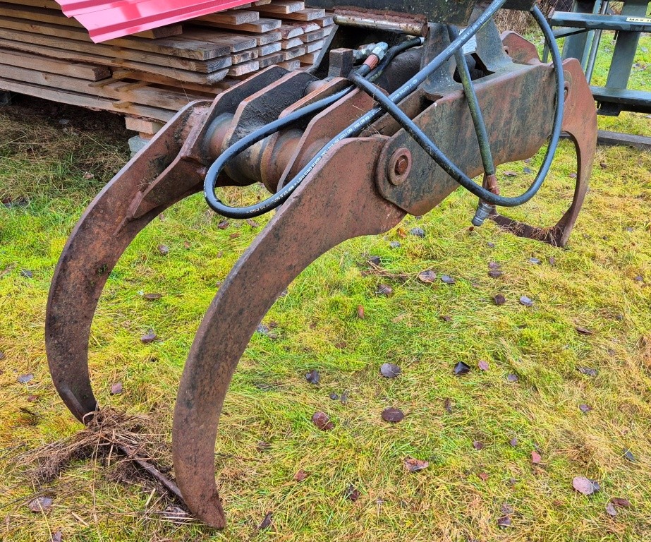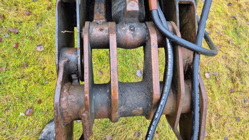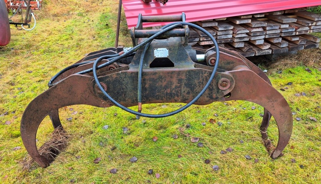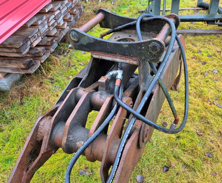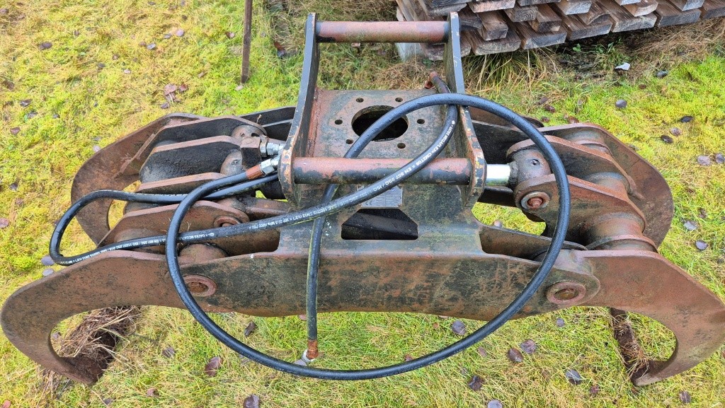 Timmergrip Hultdins SG420 till grävmaskin med renoveringsbehov, har spruckit i godset vid ena griphalvan och tappen till infästningen har släppt och blivit krokig. Säljes som rep.objekt.Fäste: S45