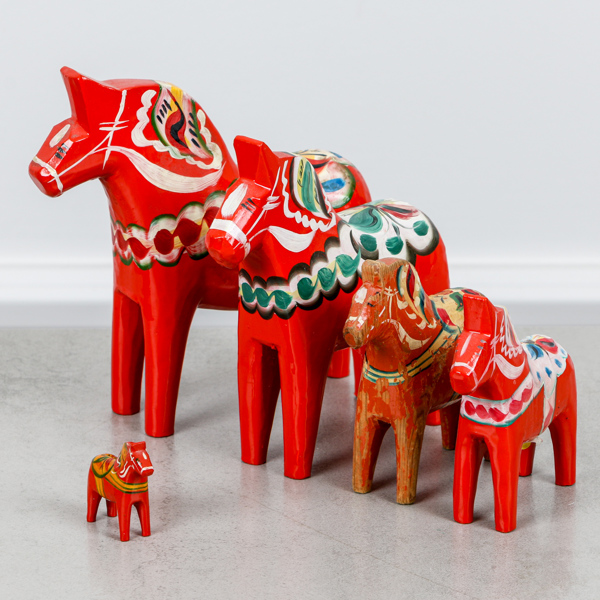 Dalahästar, 5 st, bla Nils Olsson, Nusnäs
