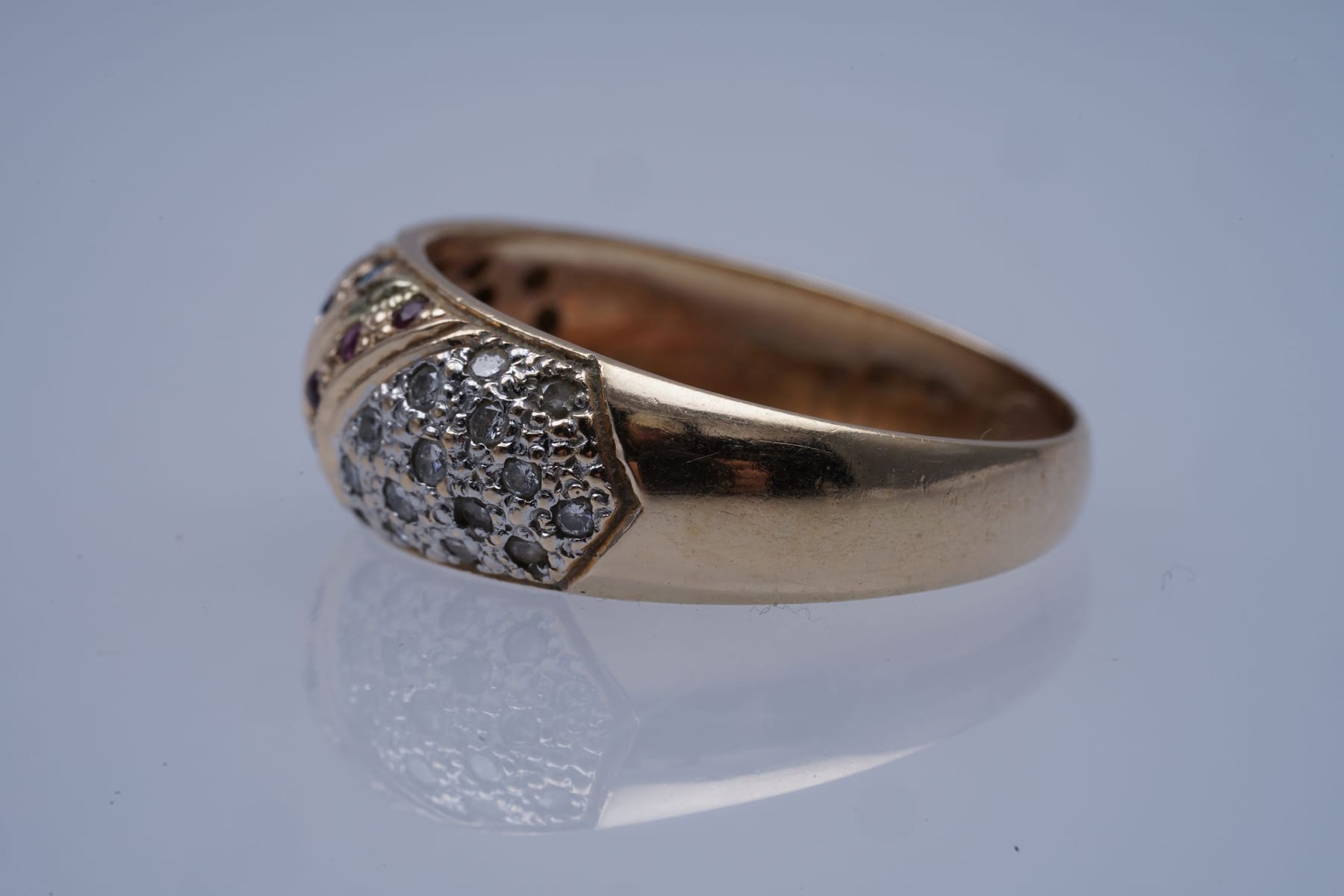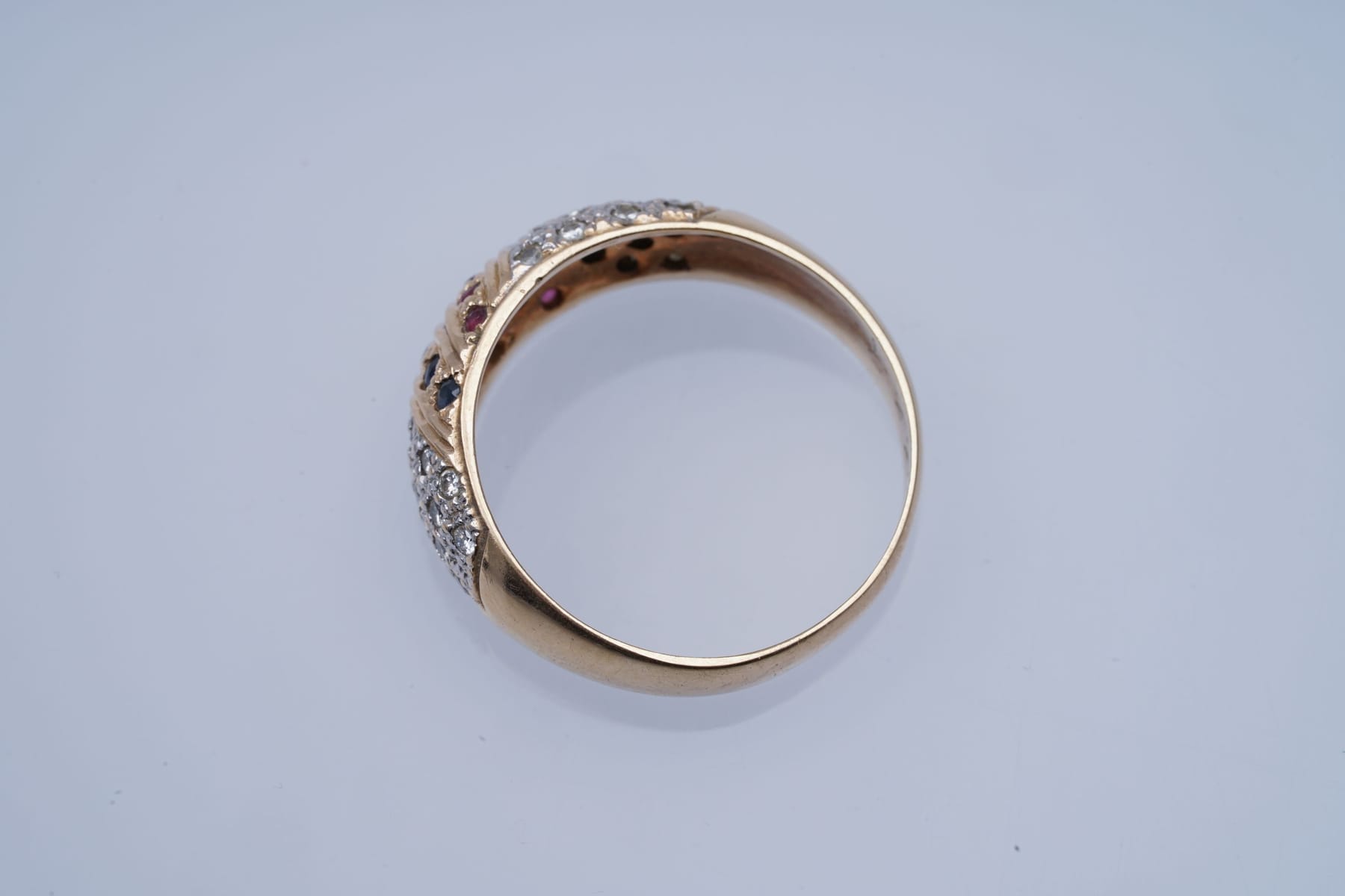 Sormus, kultaa, timantteja, safiireja ja rubiineja