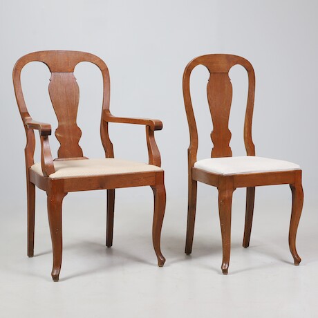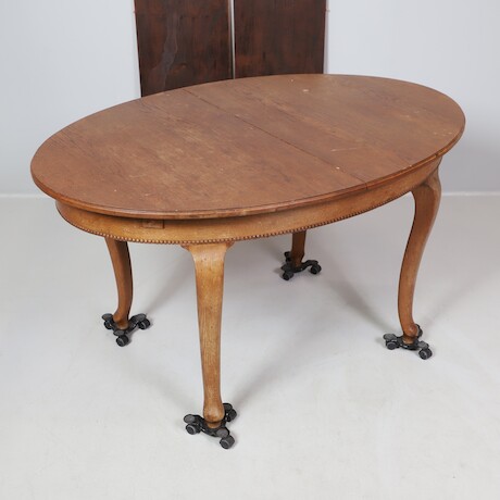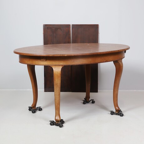 Bilder Matgrupp, ek, rokokostil, 140 x 100 + 2 ilägg á 40, H = 78, par karmstolar, 6 stolar