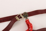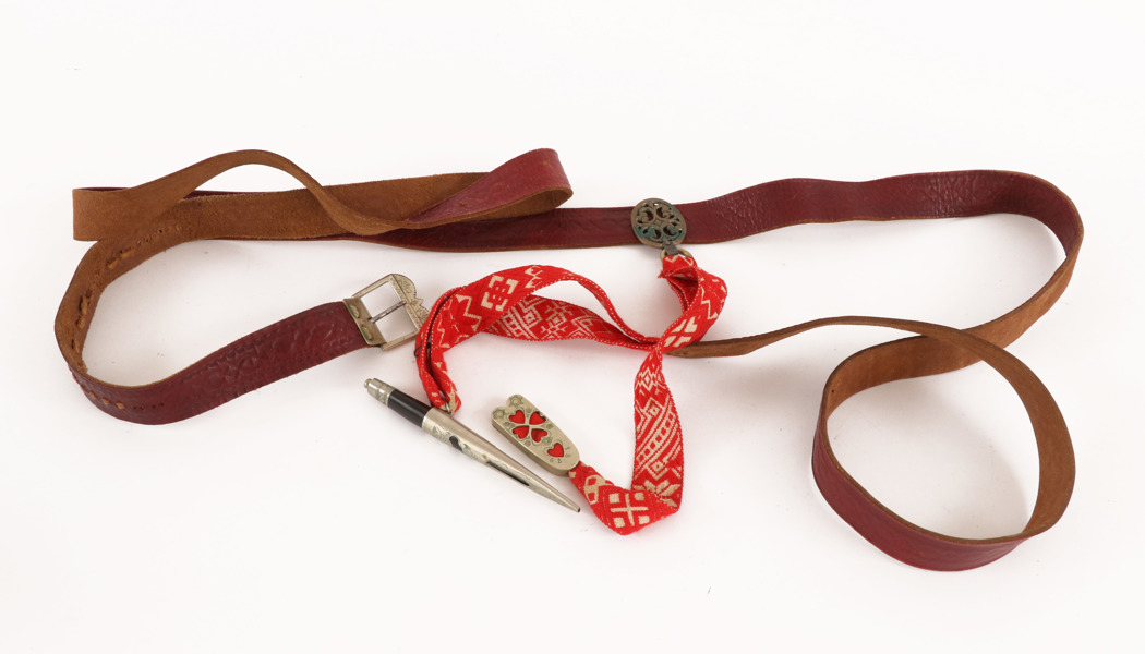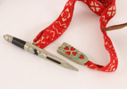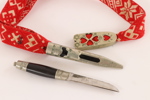 Läder. Med nålhus och kniv, förnicklad metall. Detaljer i textil.