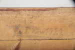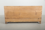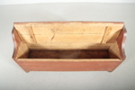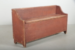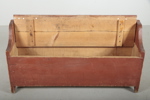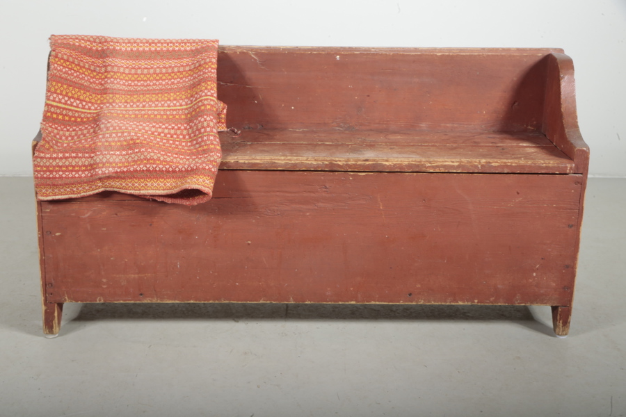 Original färg i röd. Lock med förvaring.Original textil, klädsel medföljer. Sh= 40cmL= 110cmRh= 57cm Djup= 30cm