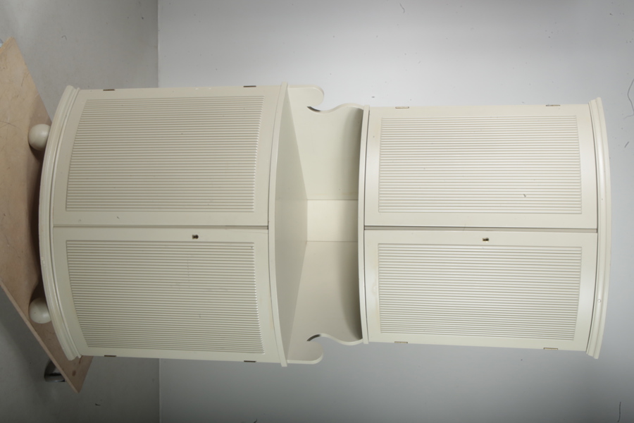 Delbart.Överdel: Dörrpar med bakomliggande hyllplan. Nedtill: Dörrpar med bakomliggande hyllplan. Nyckel saknas. H= 190cm B= 100cm Djup= 60cm